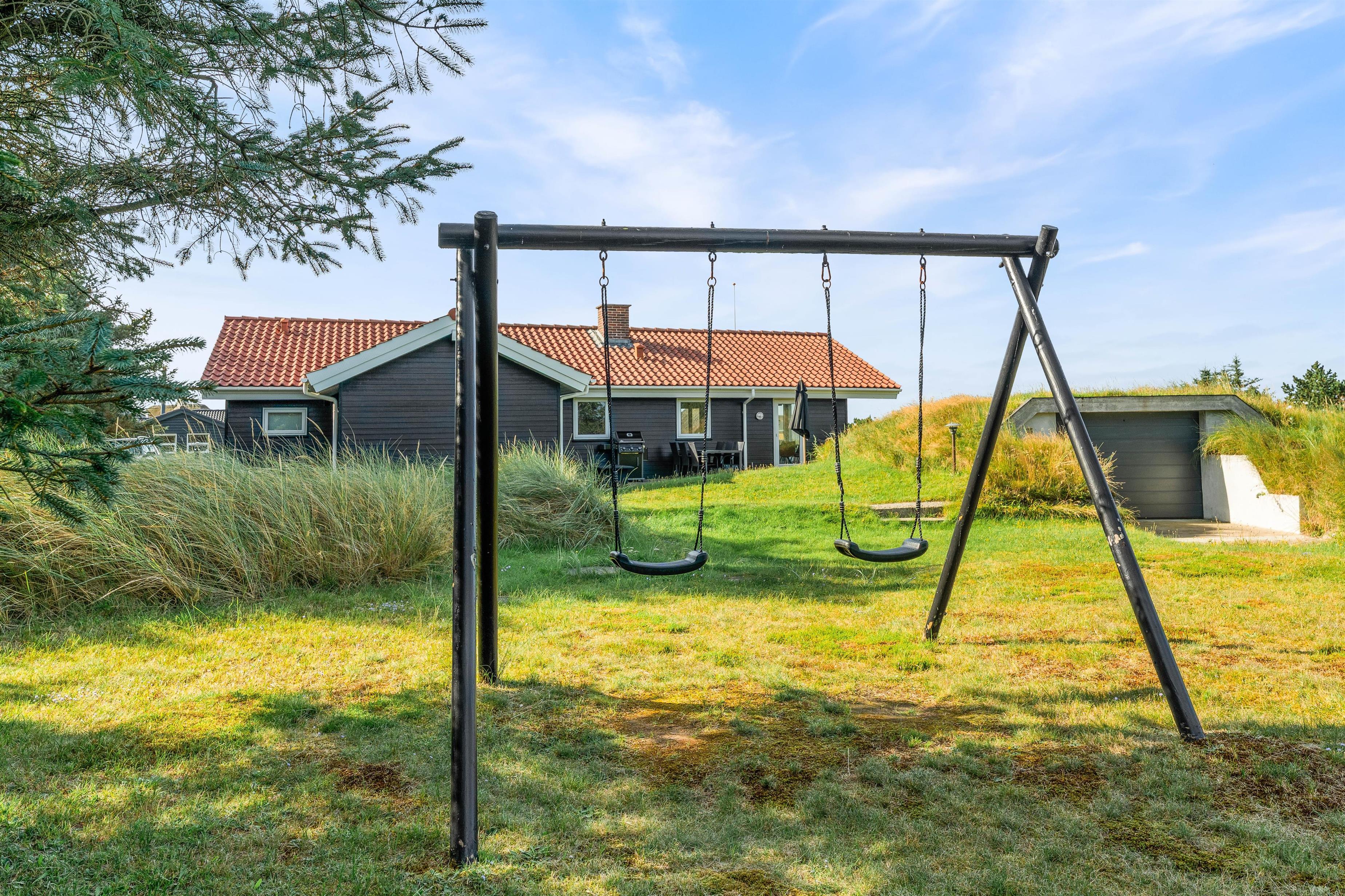Med til sommerhuset hører en velholdt græsplæne, hvor der står et gyngestativ til glæde for de yngste feriegæster.