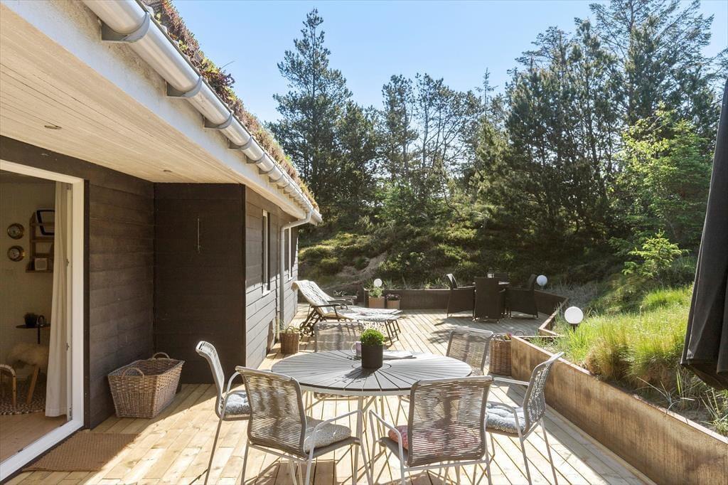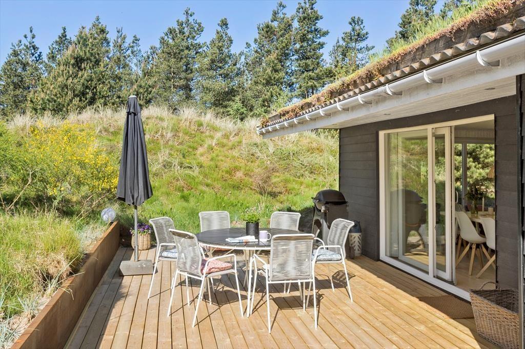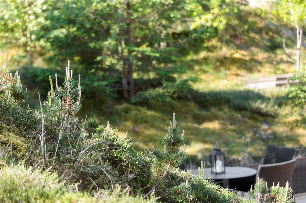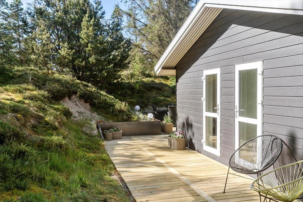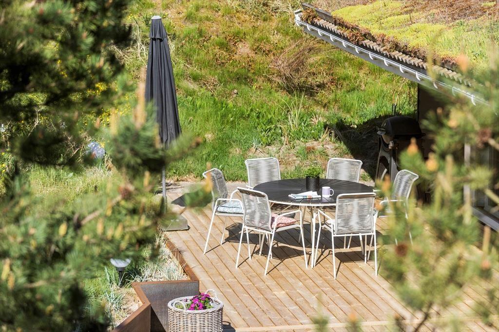 Når I er ude i det fri, kan I især mærke fordelene ved, at huset ligger i en gryde i landskabet. Naboer eller forbipasserende kan nemlig ikke se ind, og som regel er der læ på terrasserne, der ligger syd og øst for huset. I har selv udsigt til alt det grønne, når I slapper af i havemøbler og liggestole, og duften af fyrretræer, lyng og andre vilde planter er med til at minde om, at I befinder jer langt væk fra hverdagens rutiner.