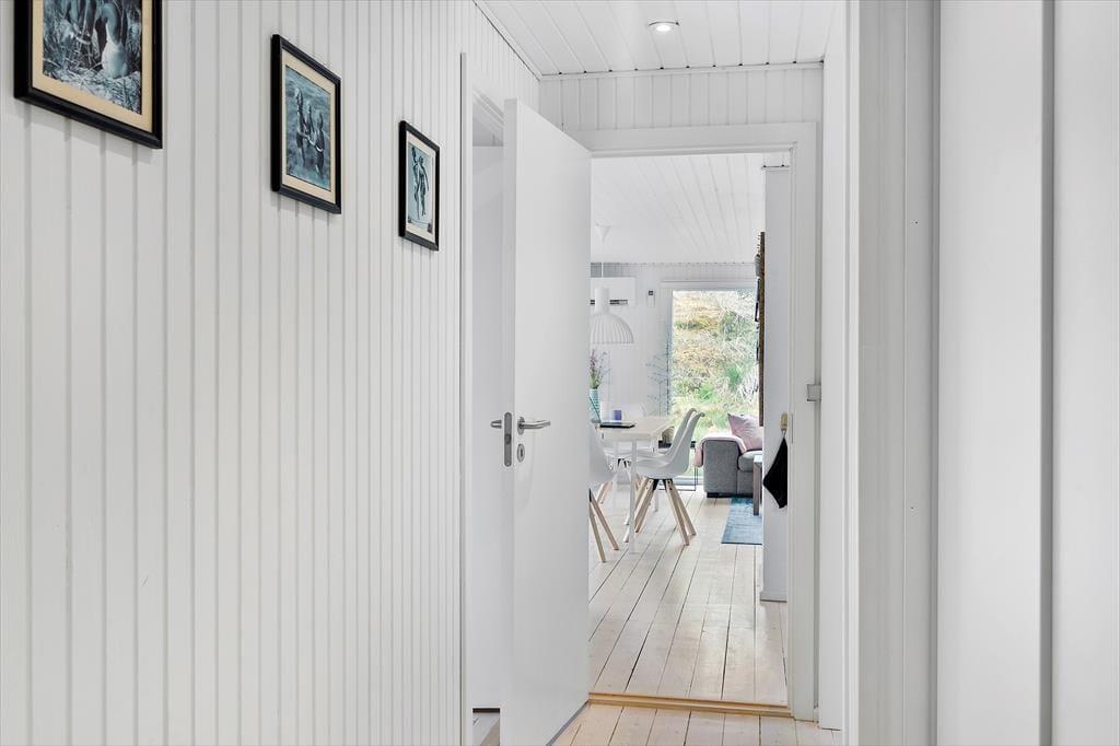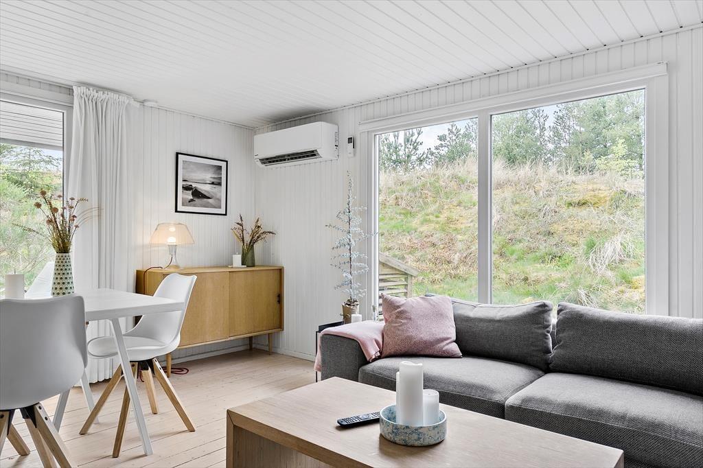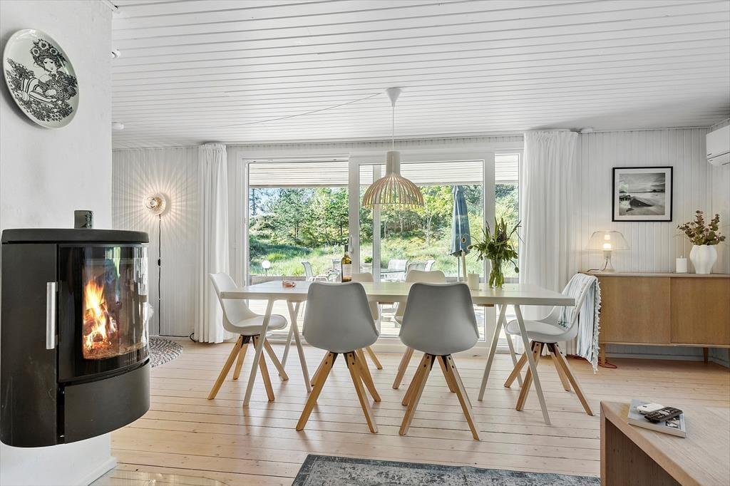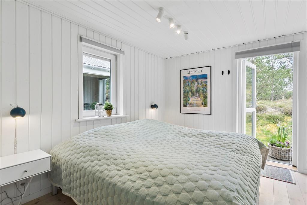 Med grønt tag og mørk træfacade passer husets ydre perfekt til den naturskønne beliggenhed. Inden døre fremstår huset lyst og luftigt, for det er nemlig blevet renoveret i 2020/2023 på enkel og stilfuld vis. Moderniseringen har blandt andet resulteret i et nyt udvidet badeværelse (2023) og et ditto køkken, og sidstnævnte ligger i åben forbindelse med stuen, som er et flot opholdsrum med brændeovn, fladskærms-tv og store vinduer med udsigt til naturgrunden. Møblementet giver rummet en dejligt varm atmosfære – så det er kort sagt lige, hvad man har brug for, når det er ferietid. Har I også brug for at sove længe, kan I se frem til at tilbringe nætterne på husets tre soveværelser, der alle er gode, reelle rum med dobbeltseng.