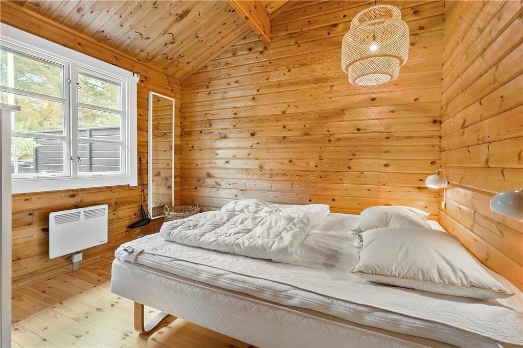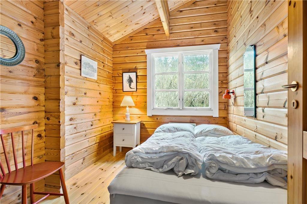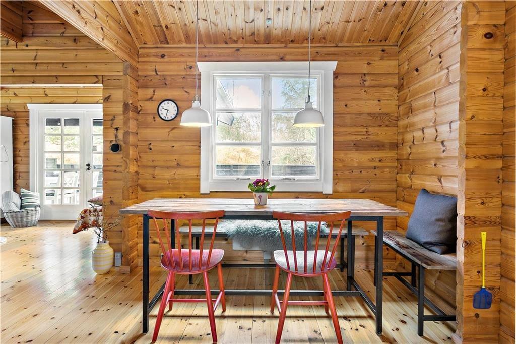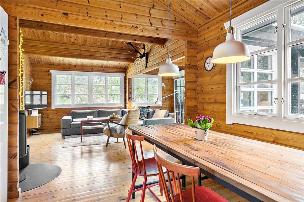 Et traditionelt bjælkehus som dette kunne lige så vel ligge i en svensk skov – men her er det nu en nordjysk klitplantage, der breder sig lige i nærheden. Hyggestemningen inden døre er dog præcis den samme, for møblementet er nøje udvalgt, så det passer perfekt til de hvide sprossevinduer, trævæggene, brændeovnen og loftet, der går helt til kip. I stuen er der flere hyggelige opholdspladser at vælge imellem, alt efter om I vil spille brætspil ved spisebordet, slænge jer i sofaafdelingen eller læne jer tilbage på briksen med en god kop kaffe og udsigt til havens nåletræer. Et pænt køkken ligger i åben forbindelse med stuen, og derudover byder planløsningen på et badeværelse og tre gode soverum med dobbeltsenge.