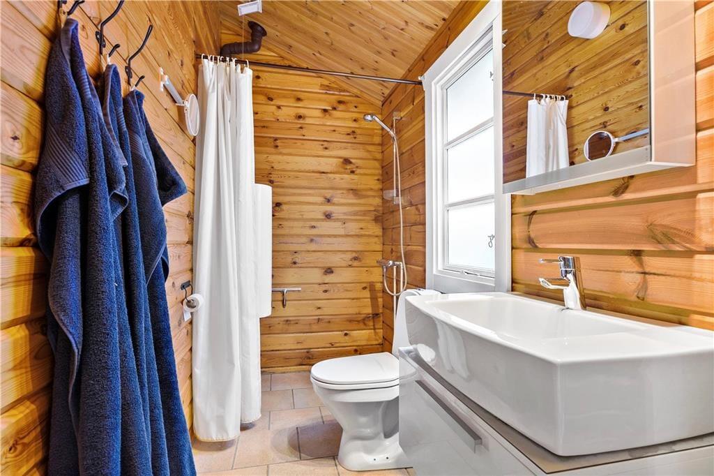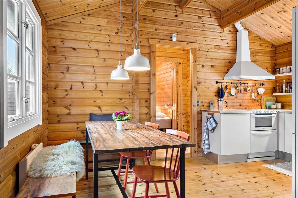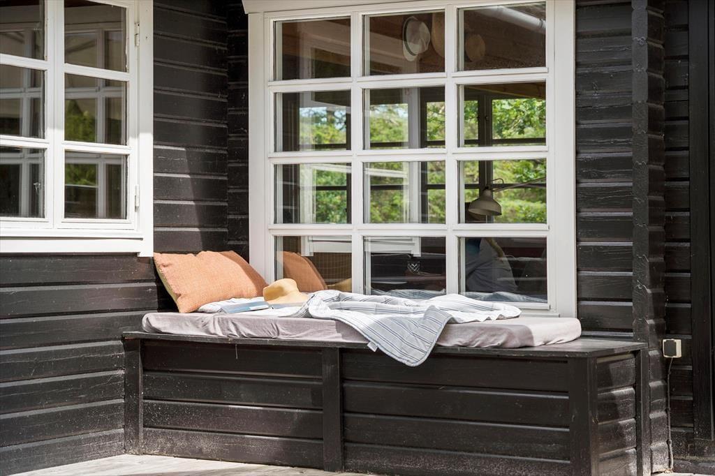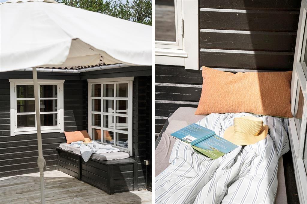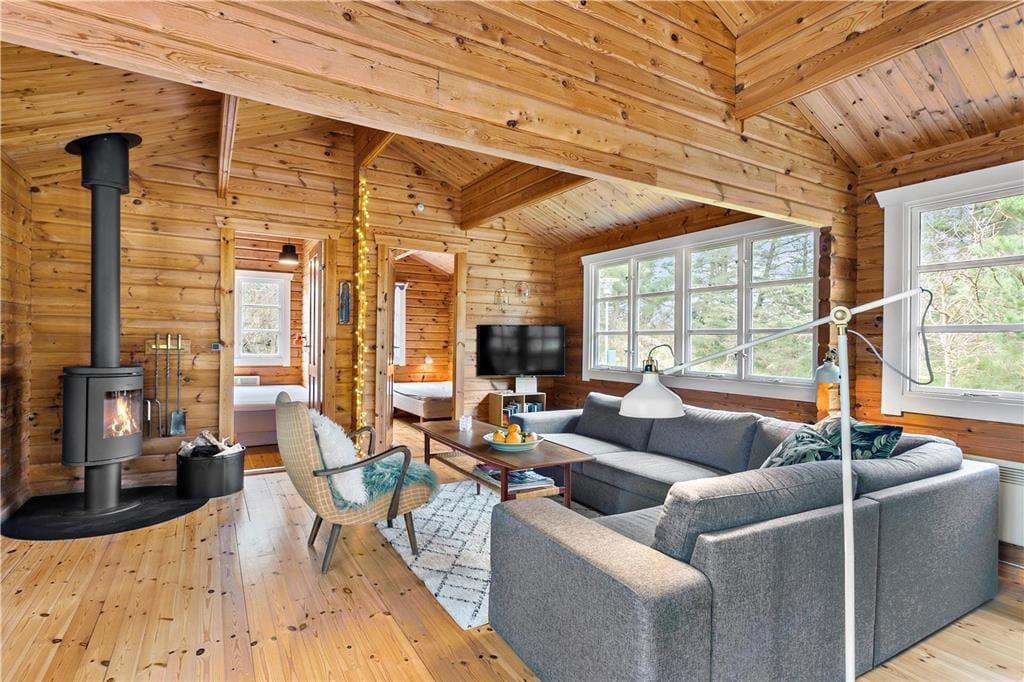 Et traditionelt bjælkehus som dette kunne lige så vel ligge i en svensk skov – men her er det nu en nordjysk klitplantage, der breder sig lige i nærheden. Hyggestemningen inden døre er dog præcis den samme, for møblementet er nøje udvalgt, så det passer perfekt til de hvide sprossevinduer, trævæggene, brændeovnen og loftet, der går helt til kip. I stuen er der flere hyggelige opholdspladser at vælge imellem, alt efter om I vil spille brætspil ved spisebordet, slænge jer i sofaafdelingen eller læne jer tilbage på briksen med en god kop kaffe og udsigt til havens nåletræer. Et pænt køkken ligger i åben forbindelse med stuen, og derudover byder planløsningen på et badeværelse og tre gode soverum med dobbeltsenge.