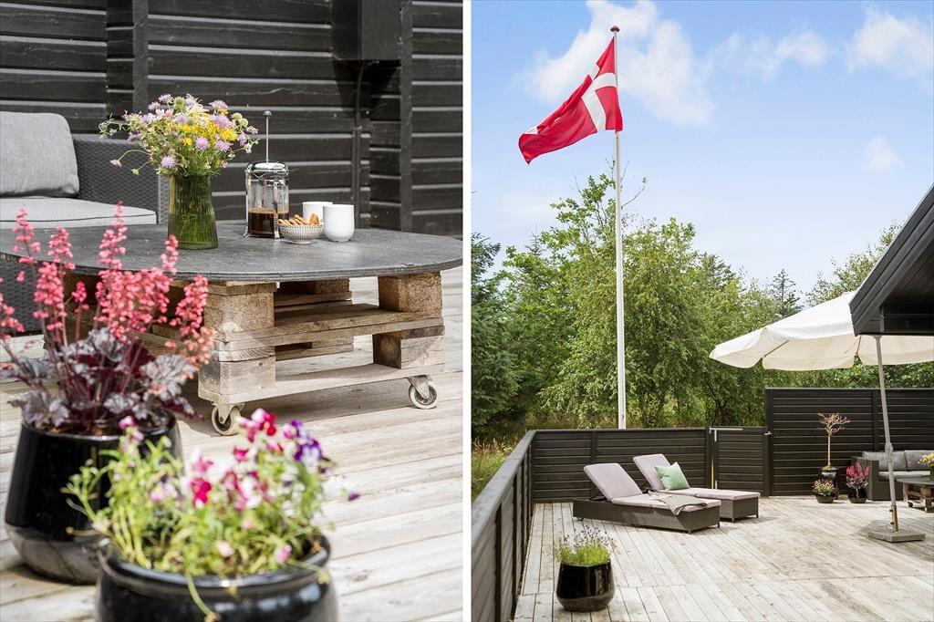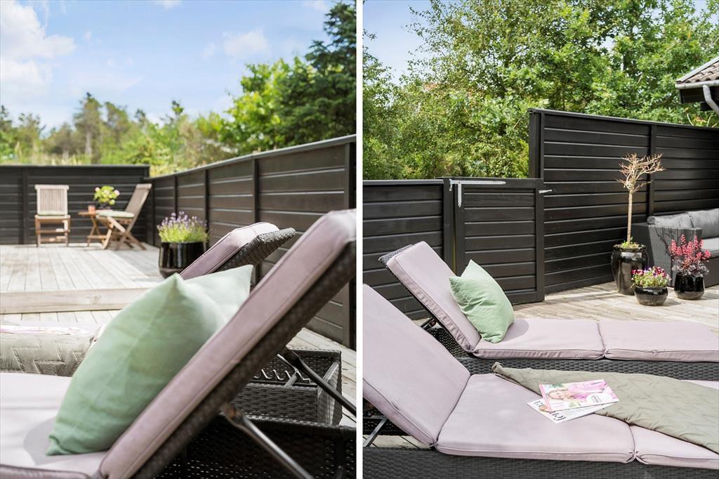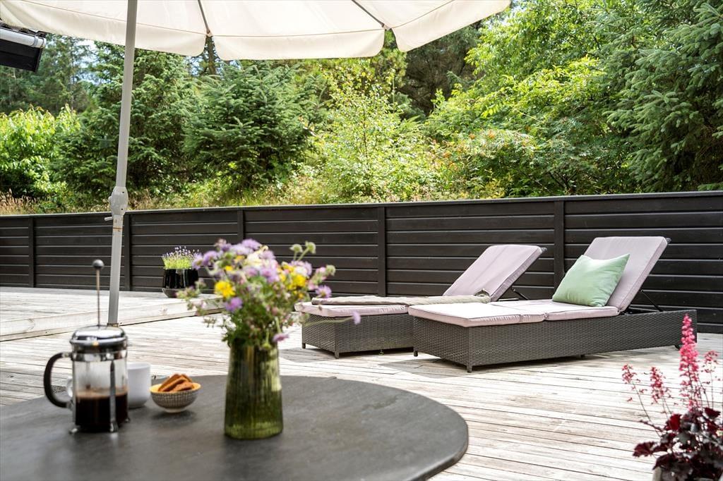 Fra stuen har I direkte adgang til en overdækket terrasse, og herfra kan I træde videre ud under åben himmel. Hele terrassemiljøet er afskærmet af træhegn og -låger, så det er helt aflukket og dejligt ugeneret – og derudover er det indrettet med loungemøbler, havebord, grill og parasol, så I virkelig kan nyde driverlivet i skønne og fredsommelige omgivelser.