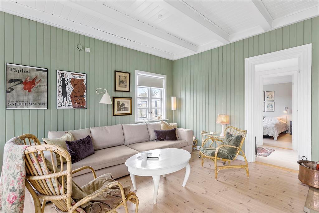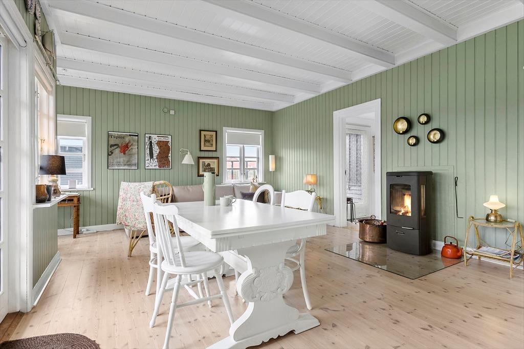 Huset emmer af sjæl og charme, og indenfor er der lyst og indbydende takket være de mange vinduespartier. De synlige loftsbjælker er sammen med brændeovnen og det charmerende interiør med til at sætte den helt rigtige feriestemning. Hjertet i huset er det hyggelige opholdsrum med lys fra flere verdenshjørner. Her er sofagruppe og en skøn spisekrog. Der er også udgang til terrassen, som bliver en naturlig udvidelse af opholdsarealet på de varme sommerdage. Køkkenet er i landlig stil, enkelt men funktionelt. Soverum er der to af – et med dobbeltseng og et med to køjesenge, samt 2 sengepladser i annex , så der i alt er plads til seks personer. Endelig er der badeværelse med brus samt gæstetoilet.