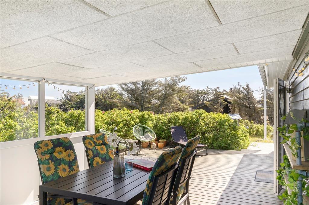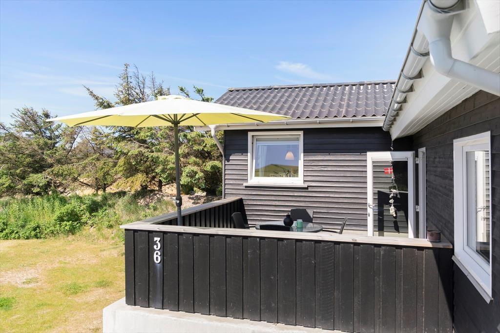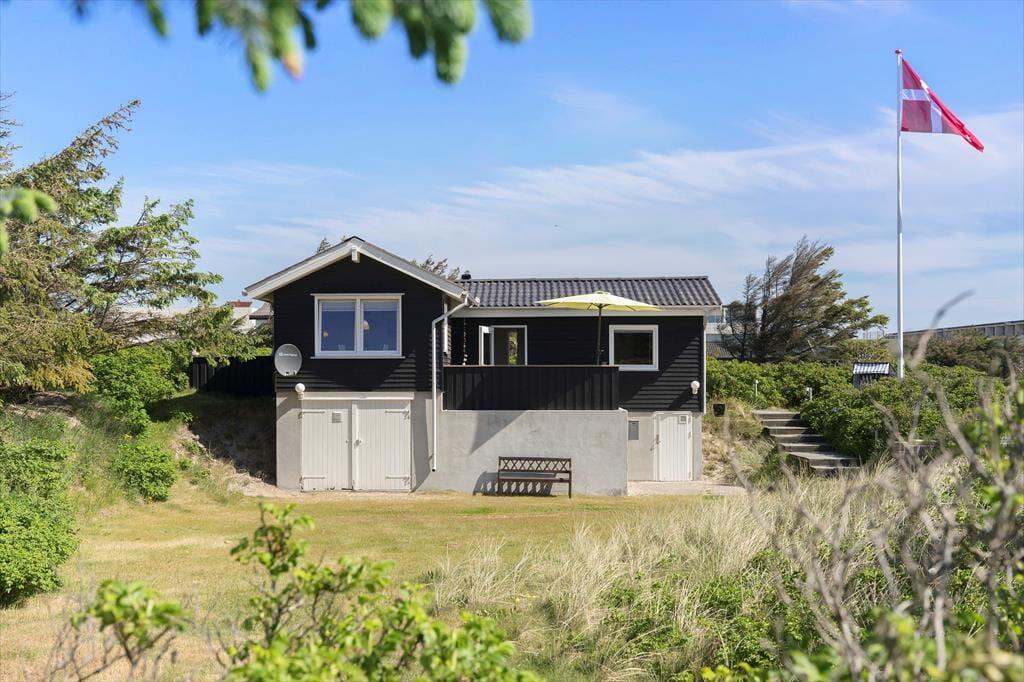 Huset ligger på en 884 m2 stor grund, der falder harmonisk ind i det omgivende klitlandskab. Der er god randbeplantning på grunden, så I får det meget privat i haven. På flere sider af huset er der dejlige terrasser, hvor I kan nyde solen og den friske luft. Den største af terrasserne er overdækket, og her kan I sidde i ly for vinden og opleve solnedgangen over klitterne.