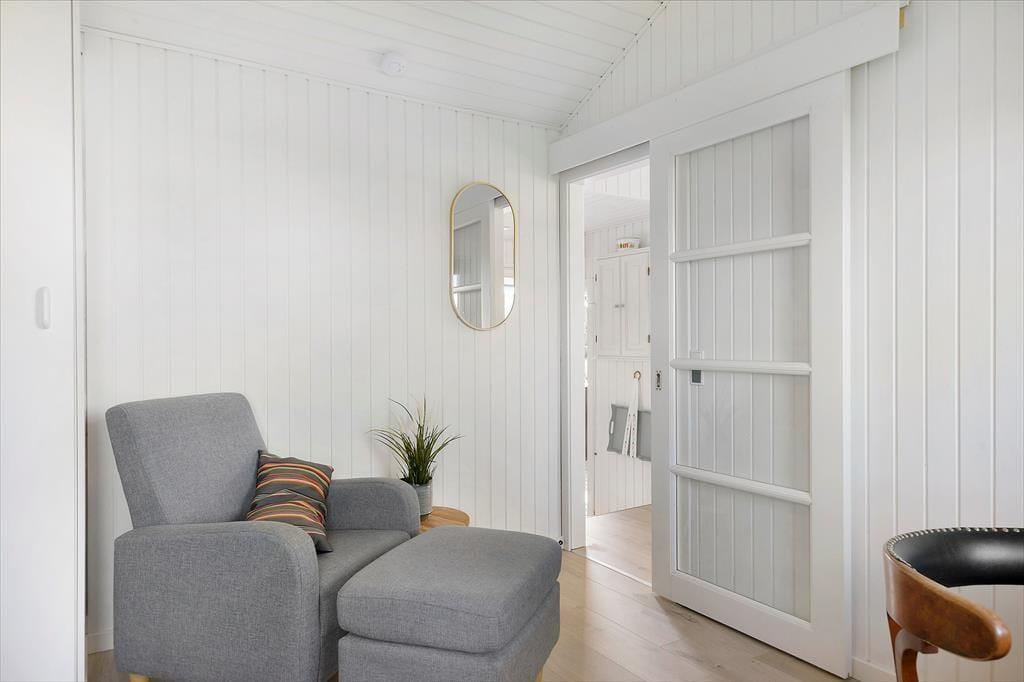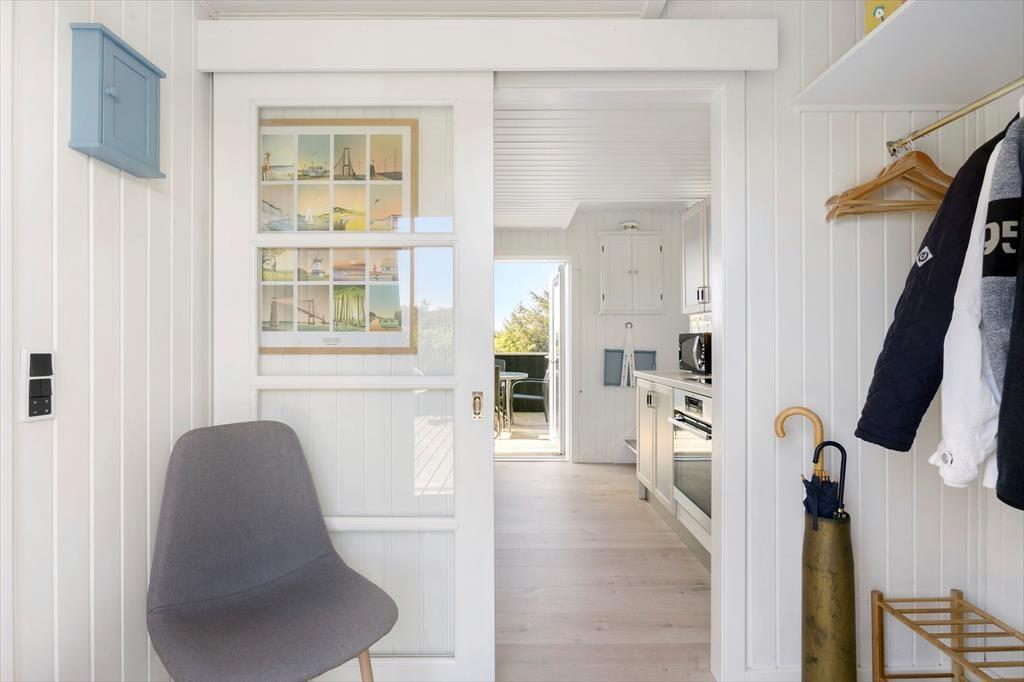 Huset er et ”rigtigt” sommerhus med sortmalet træfacade og hvide vinduesrammer - her bliver feriestemningen allerede slået an, når I parkerer bilen på grunden. Indenfor er der en lys og venlig atmosfære med hvidmalede trævægge og loft kip. I den hyggelige stue er der både spisebord og sofagruppe, og køkkenet er et rart sted at lave mad. Hefra er der direkte udgang til den sydøstvendte terrasse, hvor I kan nyde morgenkaffen i dagens første solstråler. Der er to soverum i huset – et med dobbeltseng og et med enkeltsenge – og endelig er der et badeværelse med brus.