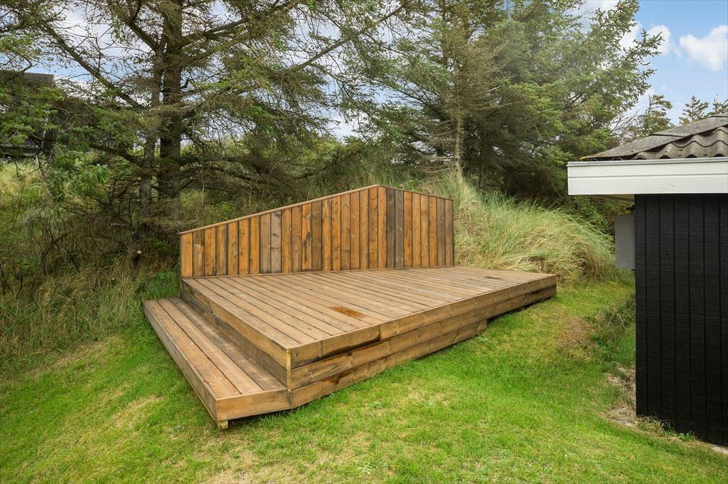 På den 1.044 m2 store og let kuperede grund kan I glæde jer til at nyde livet på flere dejlige opholdspladser: Fra stuen har I direkte adgang til en delvist overdækket terrasse, der er helt aflukket, og på den anden side af huset ligger endnu et overdækket terrasseområde, der fører ud til et ugeneret gårdmiljø med græsplæne og udendørsbruser. Trænger I ikke til et koldt skyl, men et varmt bad, vil I blive begejstrede for den sydvestvendte træterrasse med vildmarksbad.