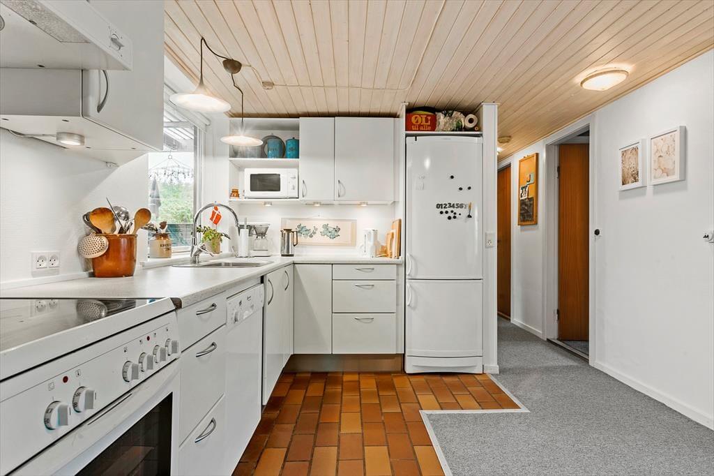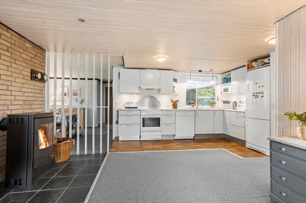 Sommerhuset går under navnet Bussely og er et charmerende træbyggeri fra 1961 på hele 130 m2. Med andre ord er der godt med plads inden døre, og derfor er det muligt at samles op til otte personer her i huset. Planløsningen er samtidig fornuftigt udformet, for hvis I holder ferie med venner eller familie, er det rart at have fire gode soveværelser, et badeværelse og et gæstetoilet til rådighed. Stue og køkken byder huset selvfølgelig også på, og de ligger samlet som en skøn opholdsafdeling med spiseafsnit, sofakrog og brændeovn.