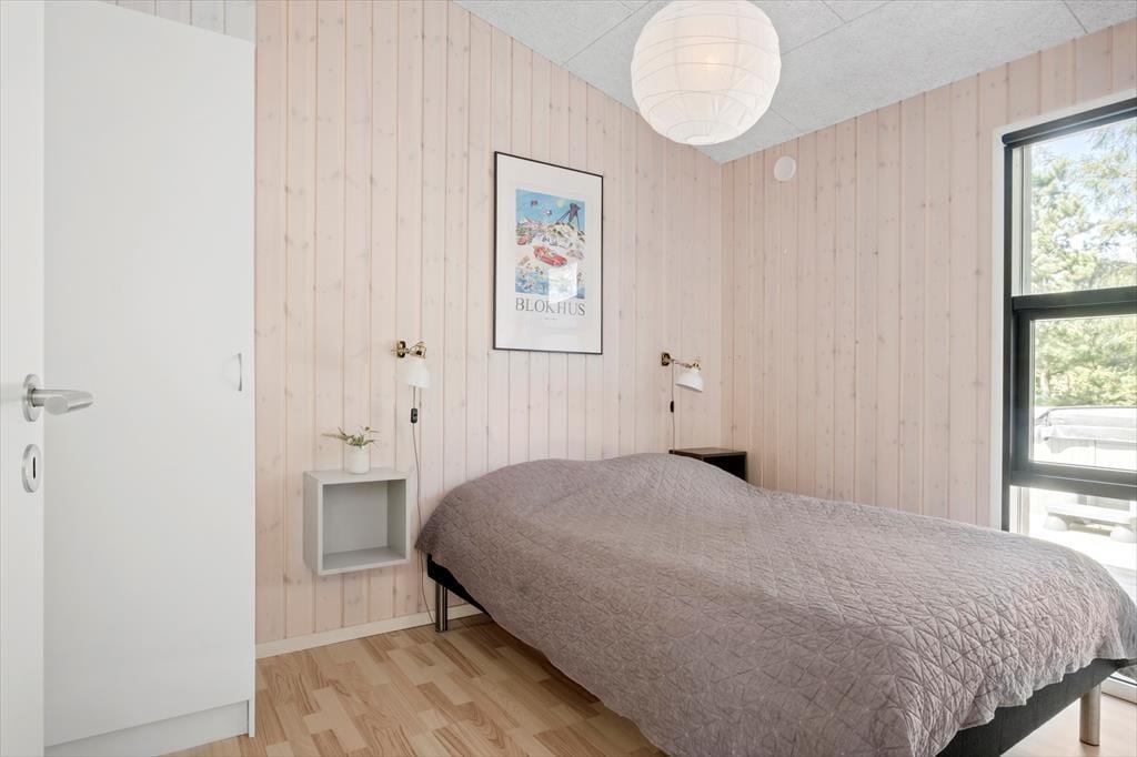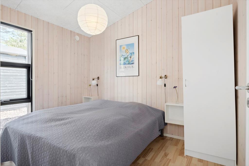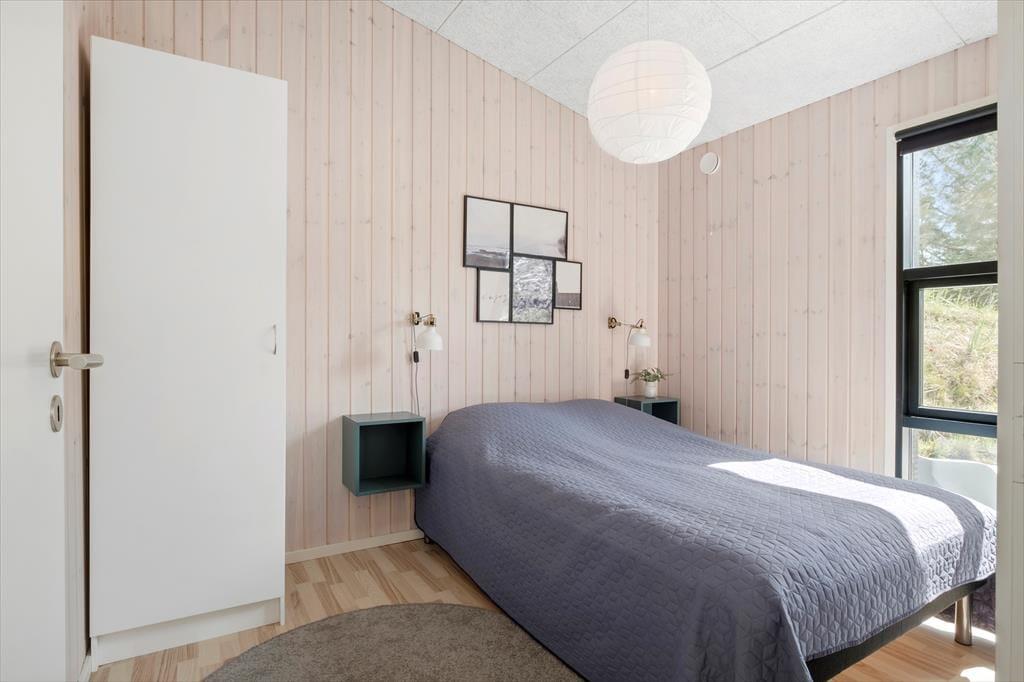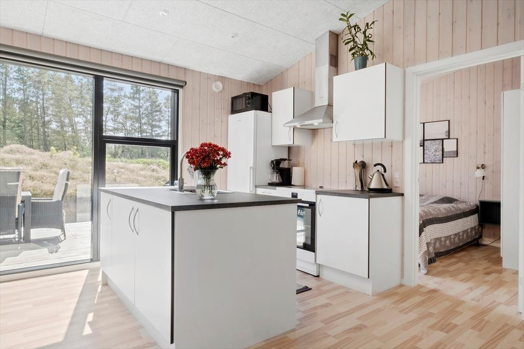 Sommerhuset er opført i 2020, og som man kan forvente af et moderne kvalitetsbyggeri, er der taget højde for både æstetikken og funktionaliteten inden døre. Med akustiklofter, flotte gulve og trælister på væggene er rumfornemmelsen rigtig god, og de store vinduer giver et dejligt lysindfald og samtidig frit udsyn til naturgrundens fyrretræer. Midt i huset ligger opholdsrummet, hvor køkken og stue er forenet, og her er der god plads til at samles hele familien. Den smarte planløsning byder desuden på et gæstetoilet med vaskefaciliteter, et badeværelse med hjørnebadekar og endelig fire gode soveværelser, der alle er udstyret med dobbeltsenge.