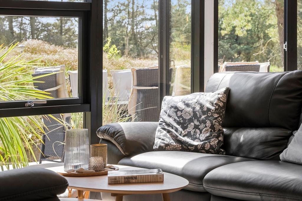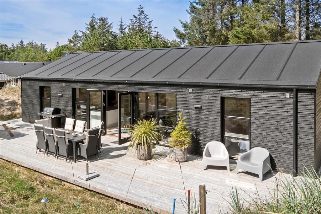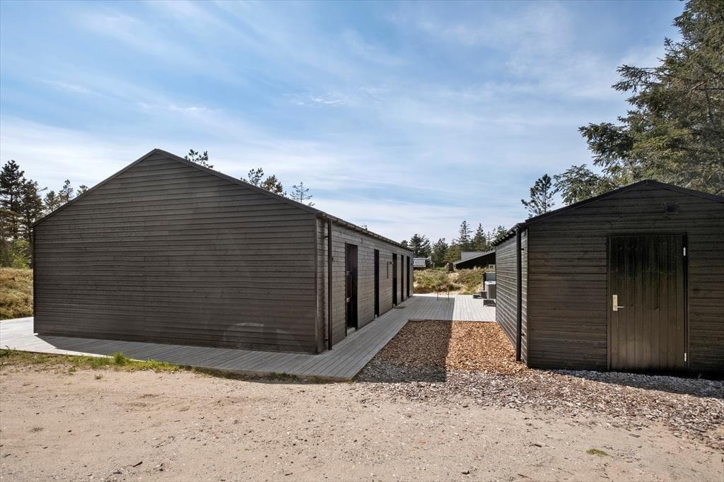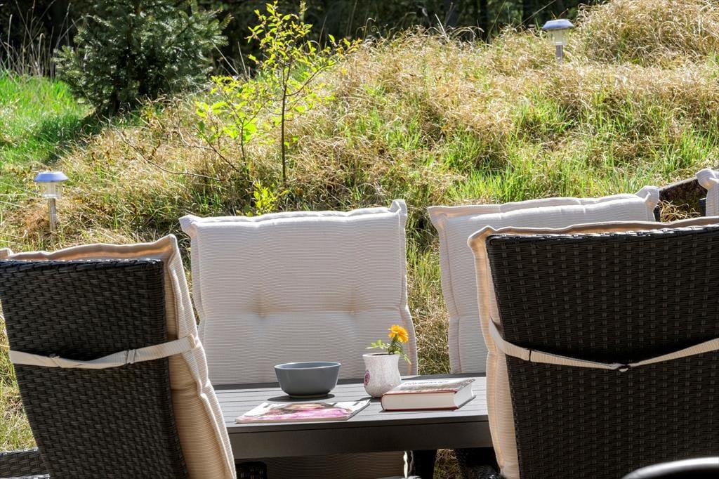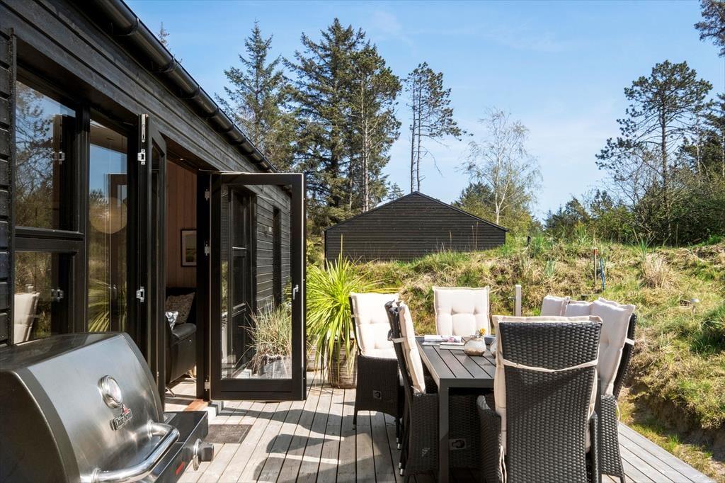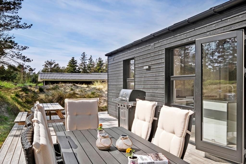 Det søde ferieliv kan også udspille sig ude i det fri på de store træterrasser, der breder sig rundt om sommerhuset. Her kan I dække op til frokost i solskinnet eller tage en siesta i skyggen af parasollen, og de yngste børn kan lege i sandkassen. På en stille sensommeraften er det også ren luksus at sidde i udespaen på den fredfyldte naturgrund, mens mørket langsomt sænker sig over Kryle Klit.