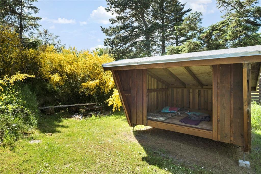 Der er terrasser på flere sider af sommerhuset. Nogle er åbne, en er overdækket og flere har læhegn, så man altid kan finde en læfyldt plet i solen, hvor den danske sommer kan nydes i fulde drag. Der er plads til boldspil og leg på plænen og sandkasse og gynge til de yngste medlemmer af familien.