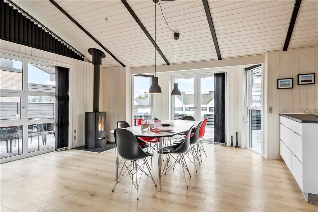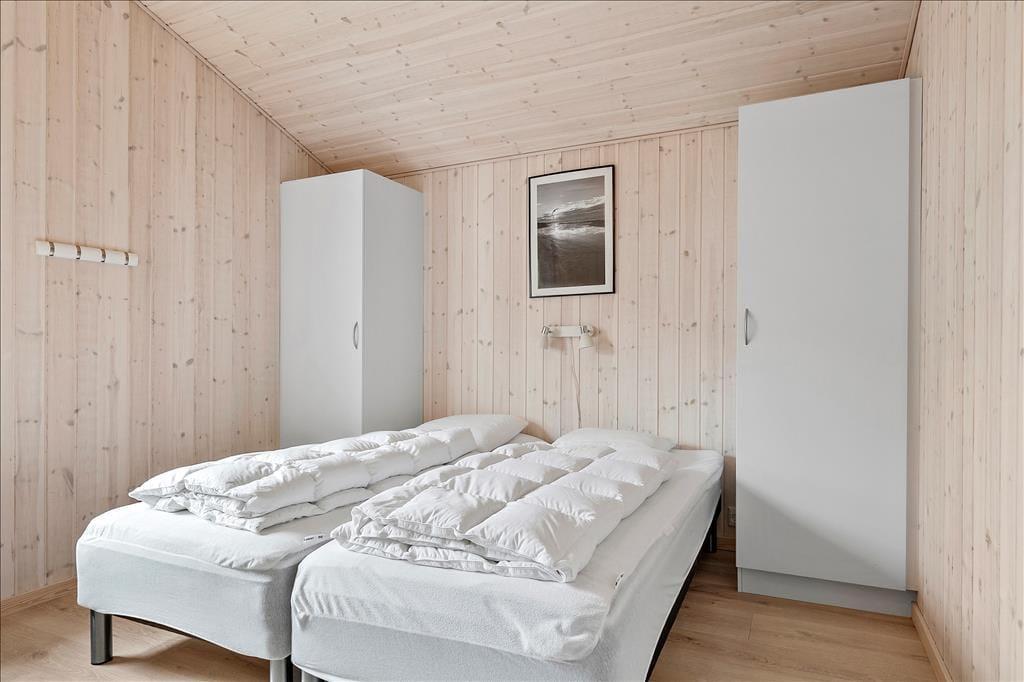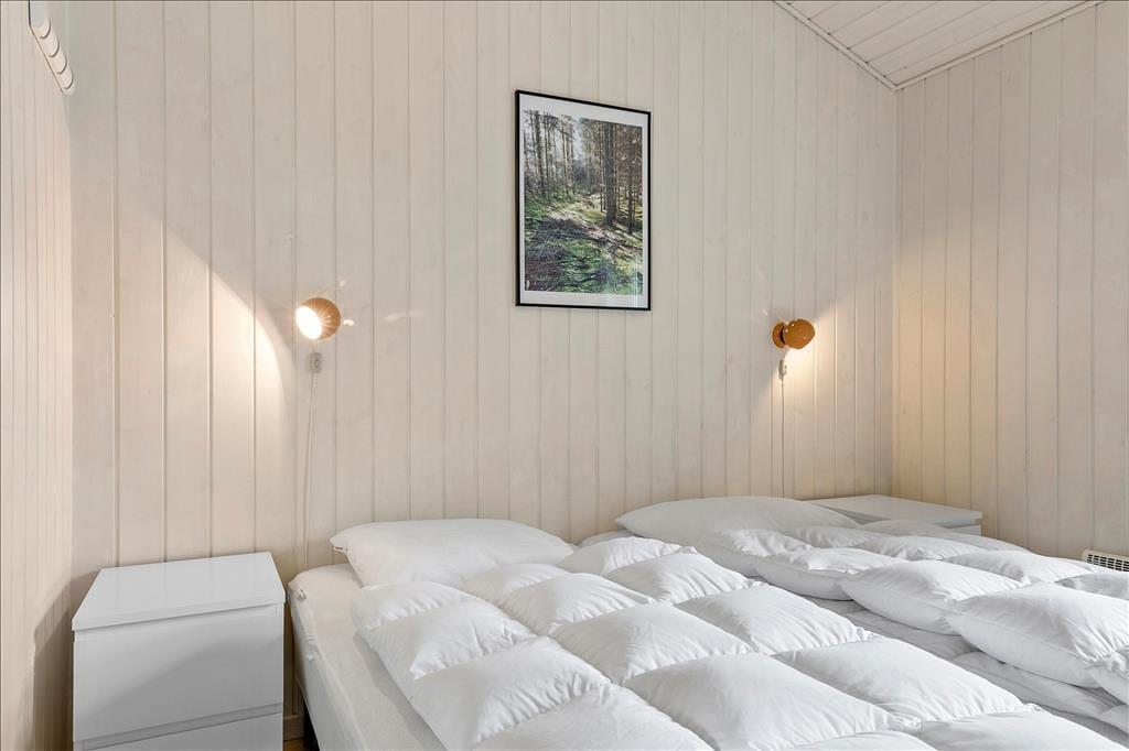 I dette sommerhus er der tænkt over indretningen, og der er lagt vægt på at skabe en god og imødekommende stemning. Her er utrolig meget lys fra de store vinduer, og med ild i brændeovnen, kan hyggen hurtigt sprede sig til hele sommerhuset. Det centrale rum er det åbne køkken-alrum, hvor man laver mad, spiser sammen og mødes til fælles aktiviteter som brætspil eller at se en god film i fjernsynet. Men også de to store flotte badeværelse skal fremhæves; her er i det ene både spabad og sauna, så man kan lave lidt wellnessstemning og vaskemaskine og tørretumbler, så der er mulighed for altid at have rent og tørt badetøj og håndklæder. Ud over det flotte store badeværelse er der i husets tre værelser med dobbeltsenge og endvidere køjesenge i de to af disse. I huset er der adgang til at logge på det gratis og trådløse internet overalt i sommerhuset.