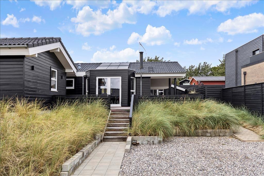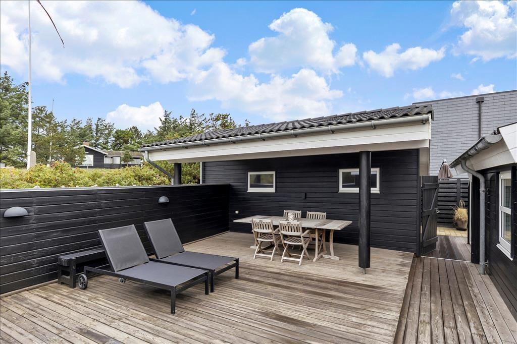 På en af de 3 skønne overdækkede terrasser som man har direkte udgang til fra sommerhuset, er ideelle til at sidde om aftenen og nyde de sidste timer af dagen. Huset er beliggende på dejlig stor klitgrund som falder i et med naturen, som kan nydes fra en af de skønne terrasser. Der er selvfølgelig grill og havemøbler til rådighed for sommerhusets gæster som sikre en god stemning når man besøger badebyen Blokhus.
