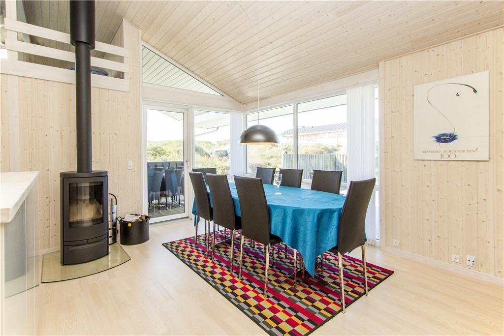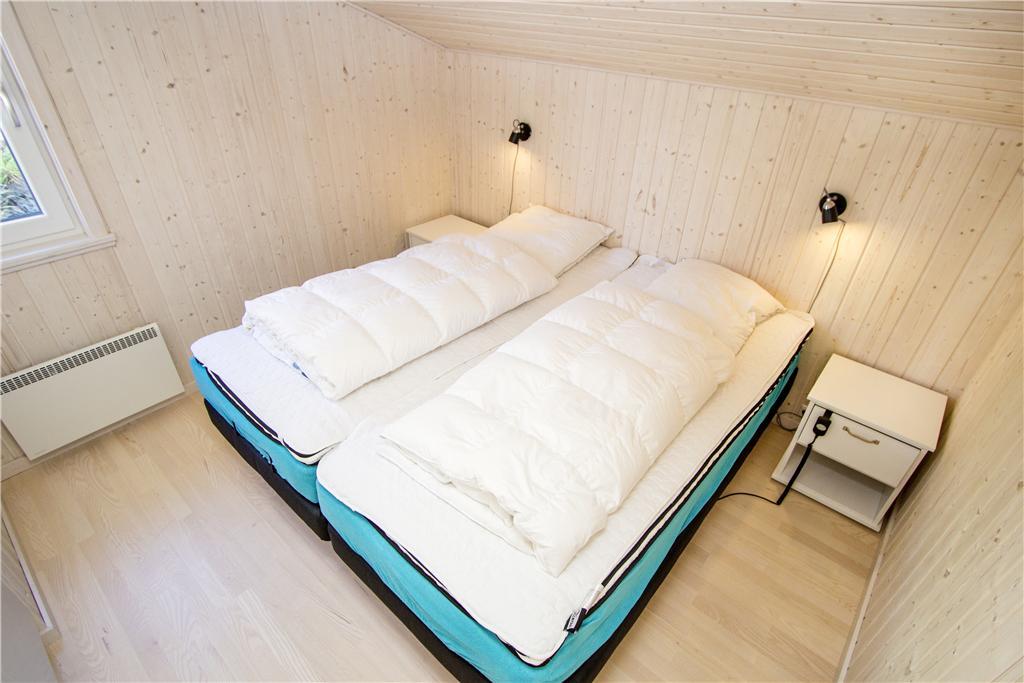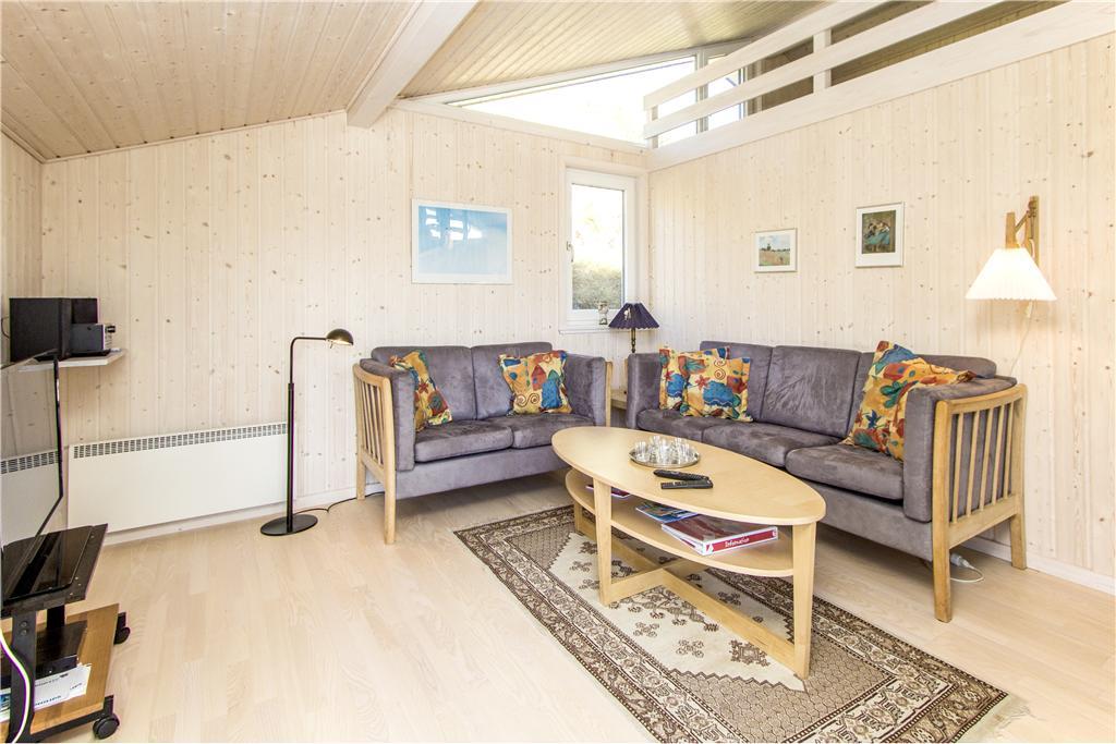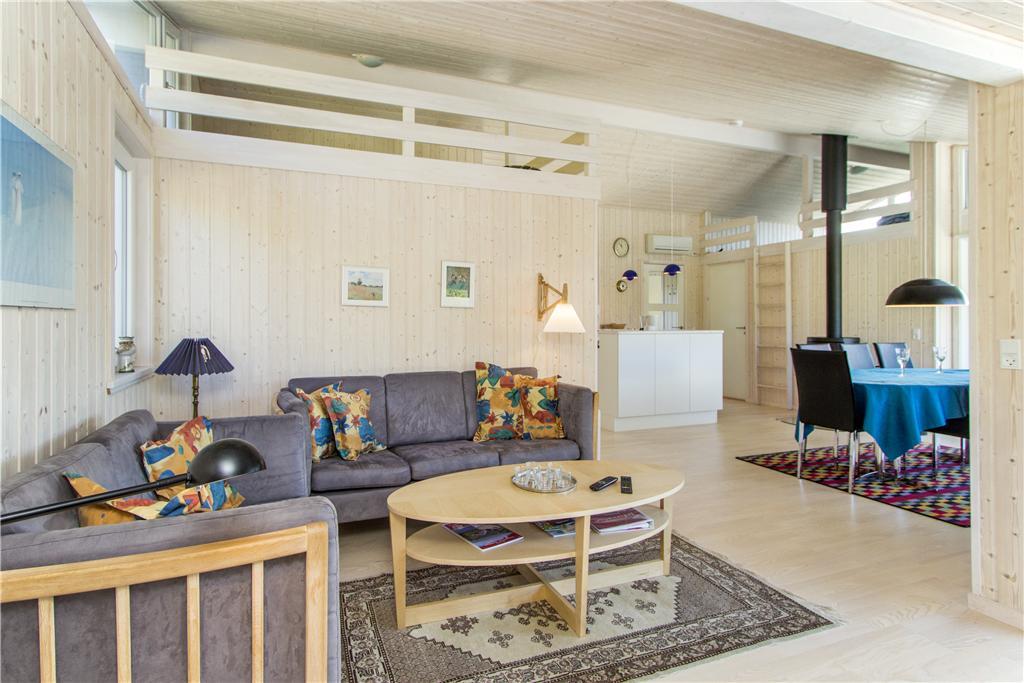 Sommerhuset fremstår med pæne møbler, funktionelle hårde hvidevarer og gode senge. Mange af rummene har loft til kip og store vinduer, som lukker det naturlige lys ind, og her er plads til en hel familie eller måske to par, som gerne vil tilbringe ferien sammen. Det centrale sted i huset er det åbne køkken-alrum med spisestue og sofahjørne ved tv’et, her kan alle være sammen om at slappe af og hygge sig med ild i brændeovnen. Huset råder over tre værelser og to flotte badeværelser, begge med brusekabine og gulvvarme, og overalt kan man gå på det gratis og trådløse internet for at søge information om områdets mange muligheder. En virkelig fin base for en vellykket ferie.