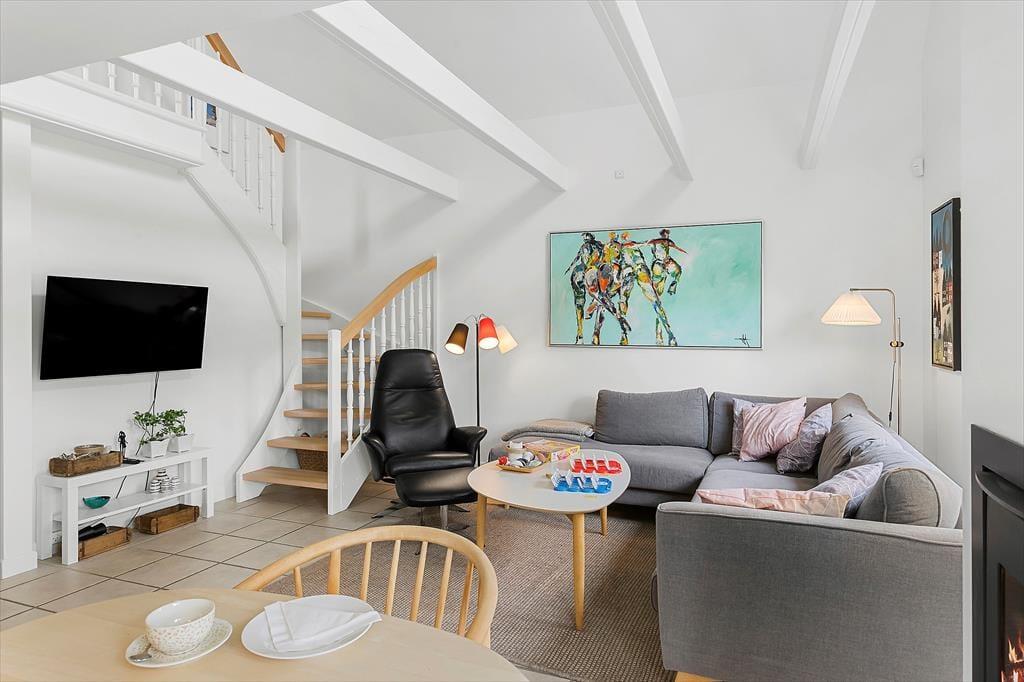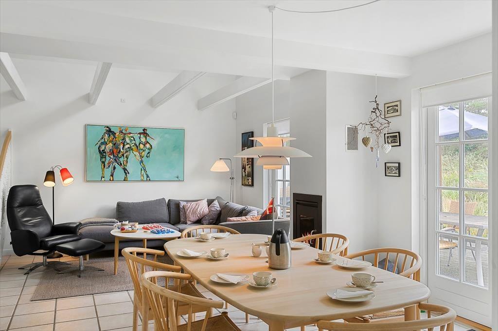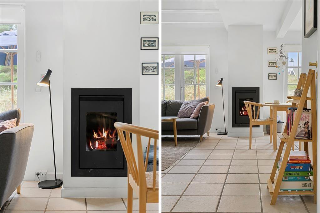 Huset byder på en rummelig og indbydende indretning, hvor du straks føler dig hjemme. Stue og køkken er åbne og forbundne, hvilket skaber en hyggelig og social atmosfære. Den store brændeovn er en skøn detalje, der gør det muligt at samles omkring varmen, når aftenens mørke falder på. I stuen er der rig mulighed for afslapning, og de store vinduespartier giver et smukt lysindfald og en dejlig udsigt til haven. Badeværelset er en lille oase, hvor du kan forkæle dig selv med et afslappende spabad eller nyde varmen i saunaen efter en lang dag på stranden.