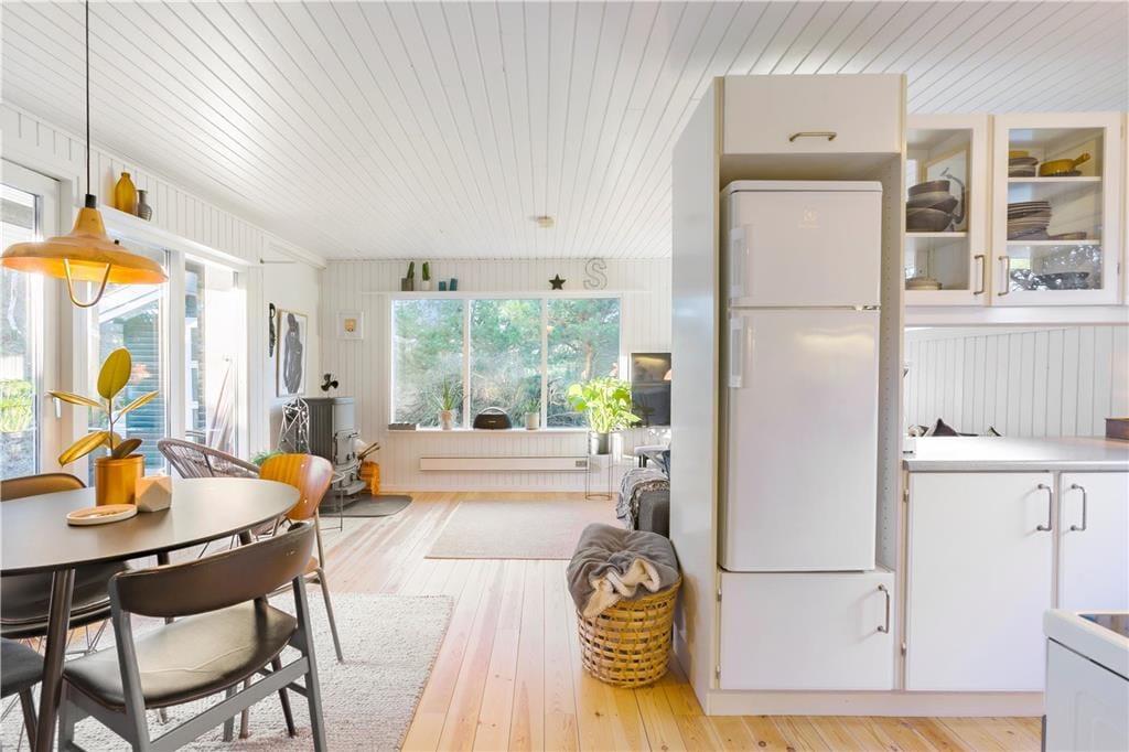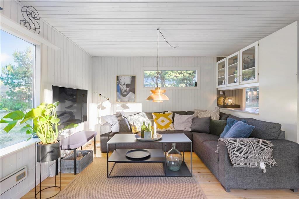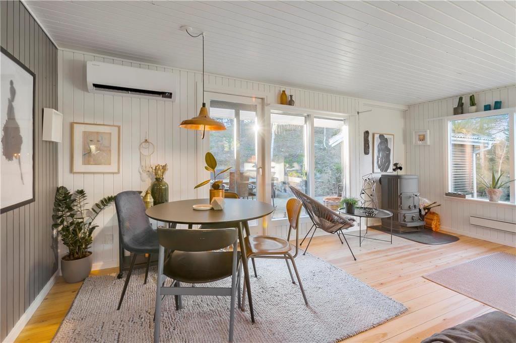 Indenfor finder du et åbent og indbydende opholdsrum, hvor hele familien nemt kan samles. Den hyggelige stue med brændeovn er et oplagt sted at tilbringe de køligere aftener, hvor I kan hygge jer med spil, film eller bare varme jer foran flammerne. De store vinduer giver masser af lys og skaber en behagelig, indbydende atmosfære. Det er let at føle sig hjemme her, hvor der er masser af plads til at slappe af og nyde hinandens selskab. Sommerhuset er udstyret med funktionelle og komfortable møbler, som understøtter den afslappede ferieoplevelse.