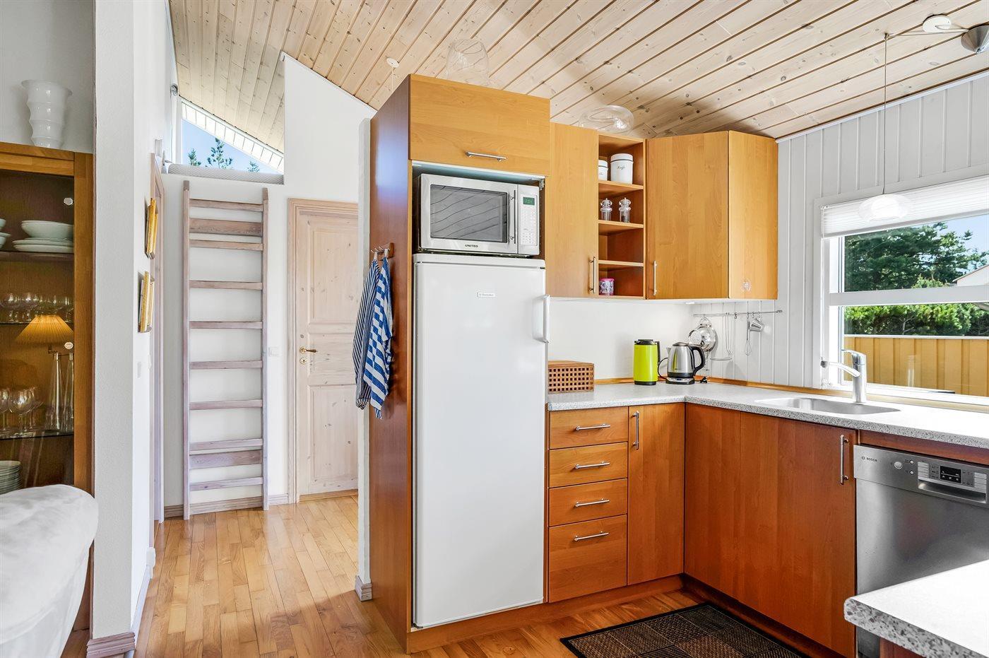 Køkkenet er udstyret med 1 køleskab. Der er 4 keramiske kogeplader, varmluftovn, mikrobølgeovn samt opvaskemaskine.
