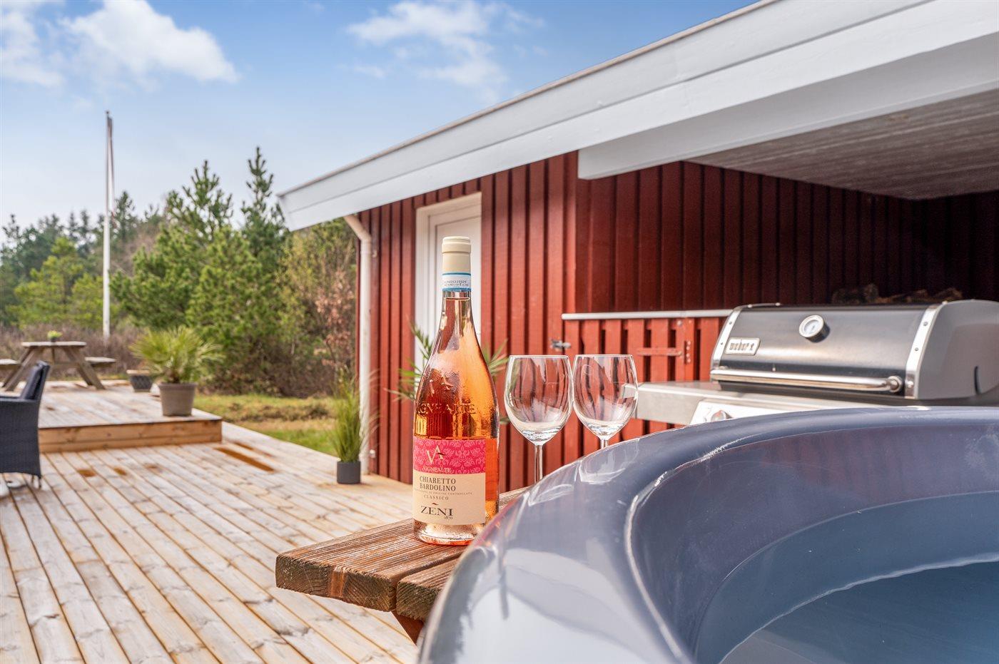 En af de helt særlige perler ved sommerhuset er det fantastiske terrasseområde, der virkelig får det bedste ud af den naturskønne beliggenhed. Med hele 13 m² overdækket terrasse kan du nyde udendørslivet, uanset vejret. Her finder du også et luksuriøst vildmarkskar, hvor du kan forkæle dig selv med et afslappende bad, mens du ser på solnedgangen over naturen.