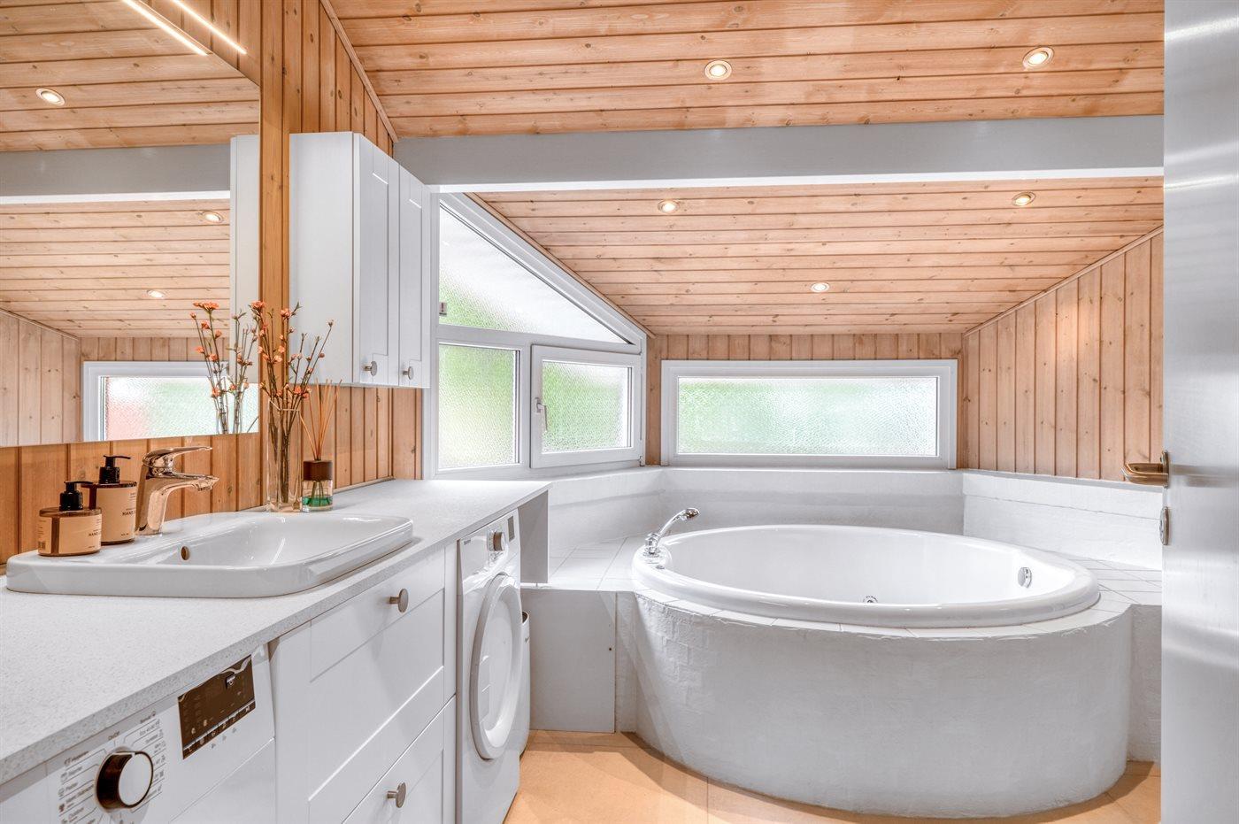 Der er 2 badeværelser med bruseniche og 2 toiletter. Der er gulvvarme på 2 badeværelser. I saunaen er der mulighed for afslapning.
