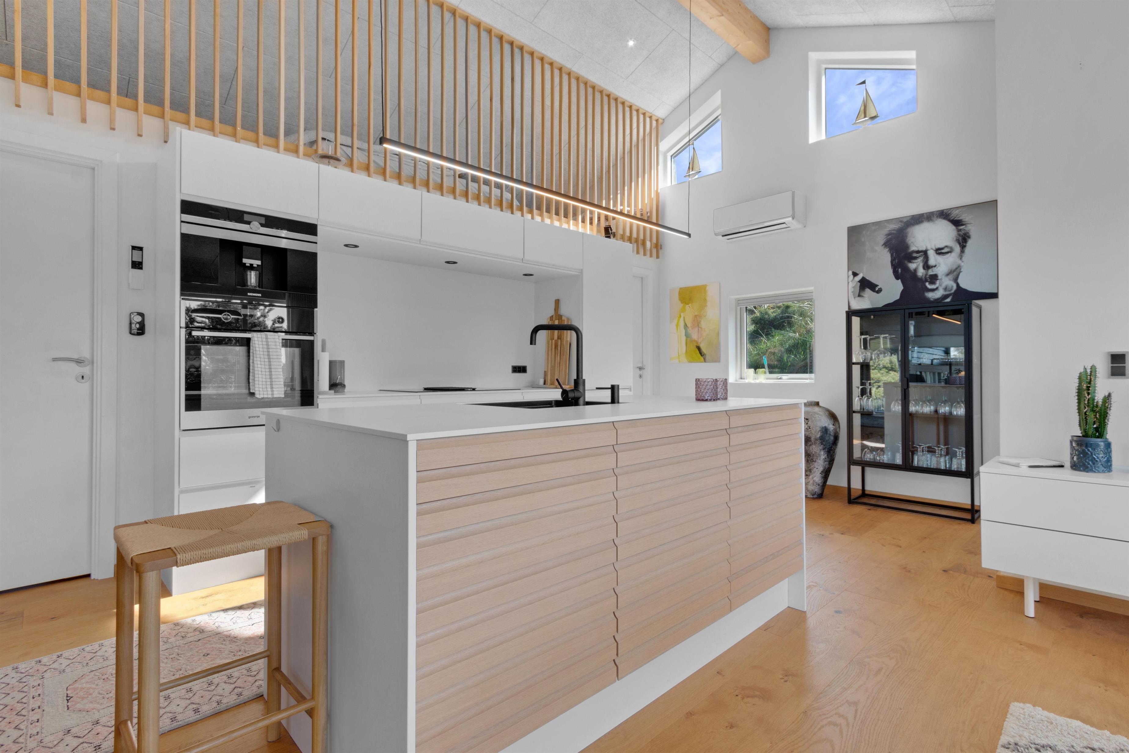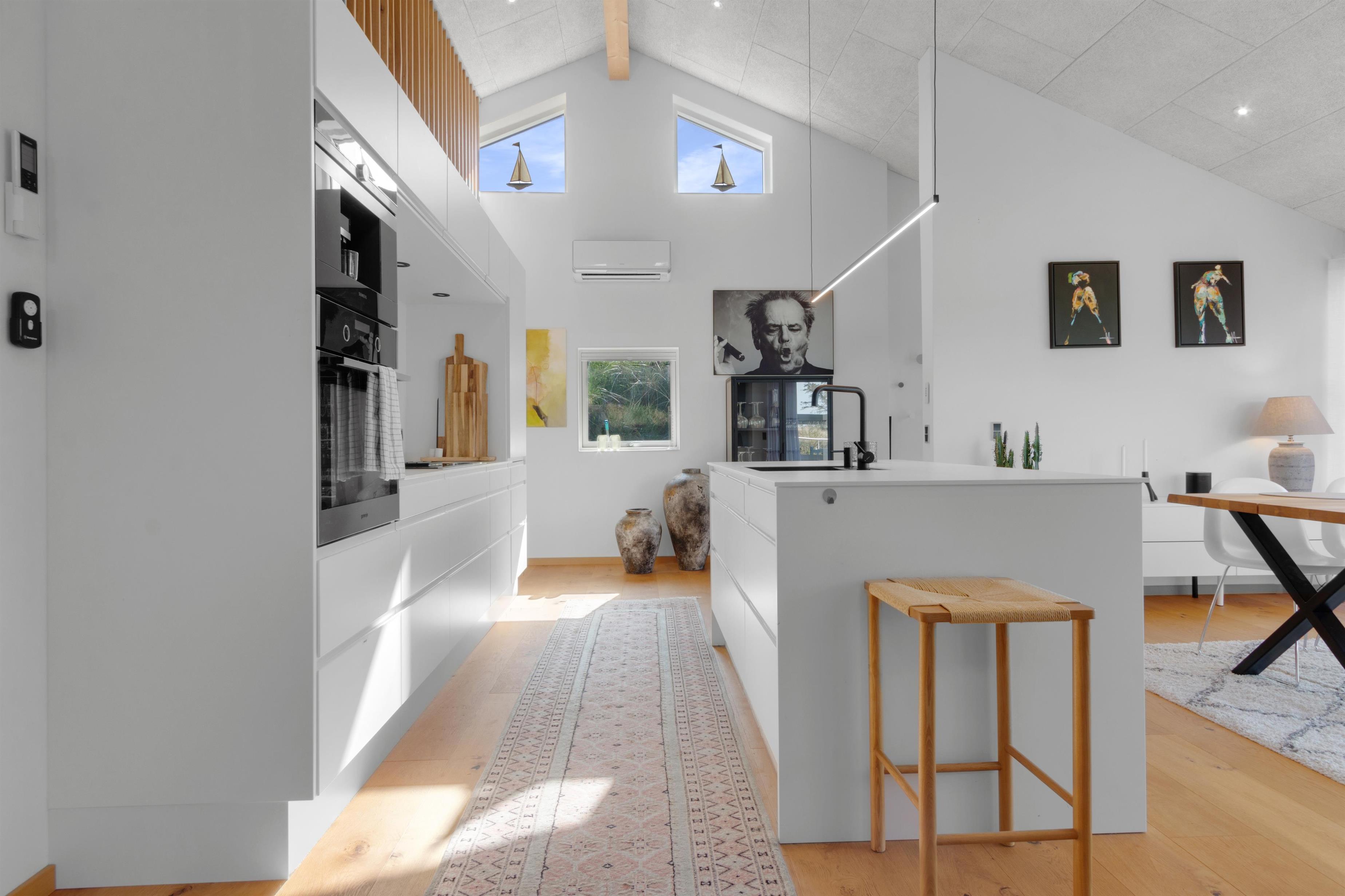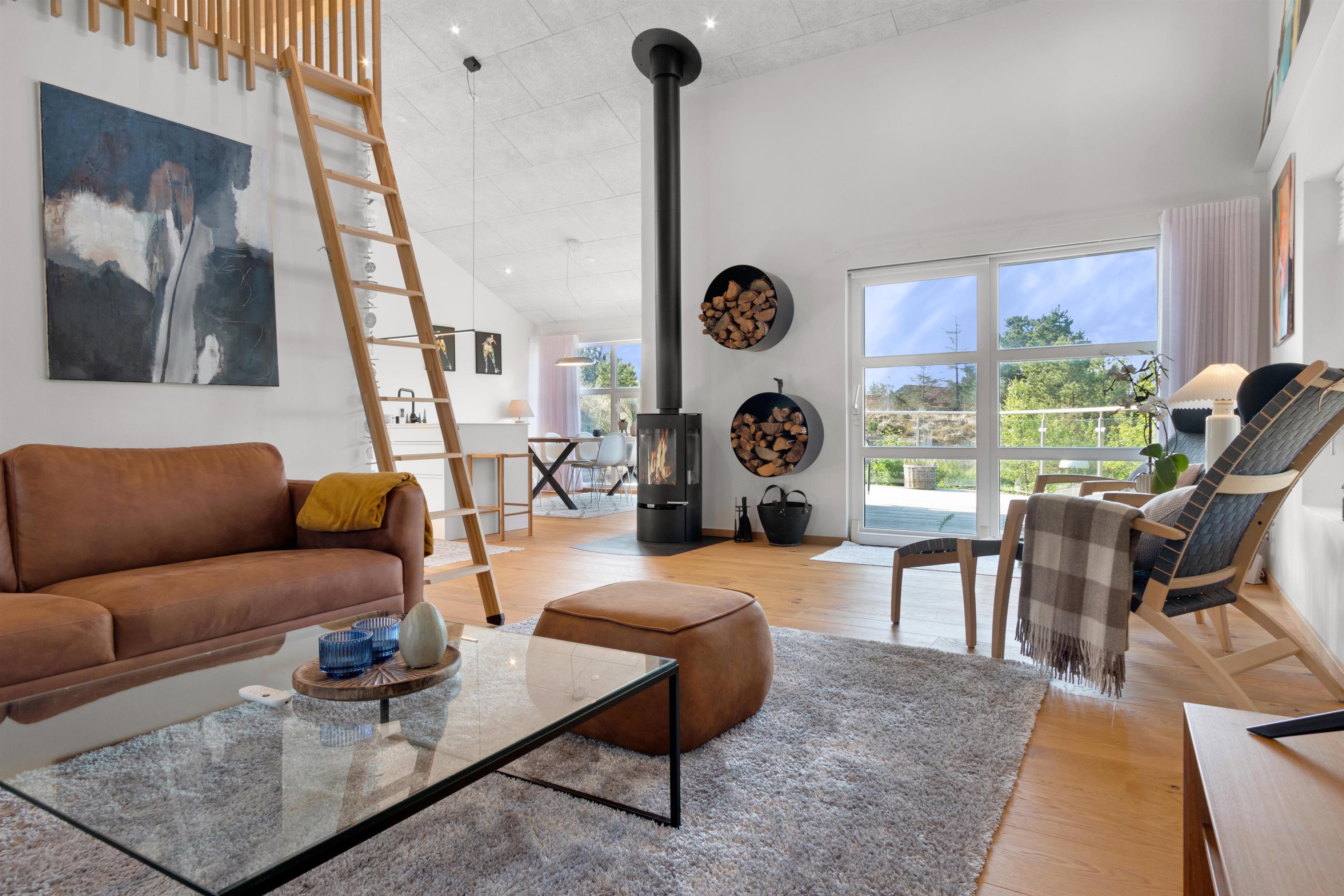 Her kan du tale om åbent layout og masser af samtale- og hyggerum! Husets dejlige, lyse køkken er i åben forbindelse til stue og alrum, og herover er en fantastisk hems, der kun afskærmes af et dekorativt og flot gelænder. Det giver hele rummet en fornemmelse af lys, luft og lækkerhed. Der er to soverum og en hems - plads til i alt 6 personer. Dertil er der et anneks med plads til to overnattende gæster. 1 badeværelse - og alle rum er i forbilledlig stand.