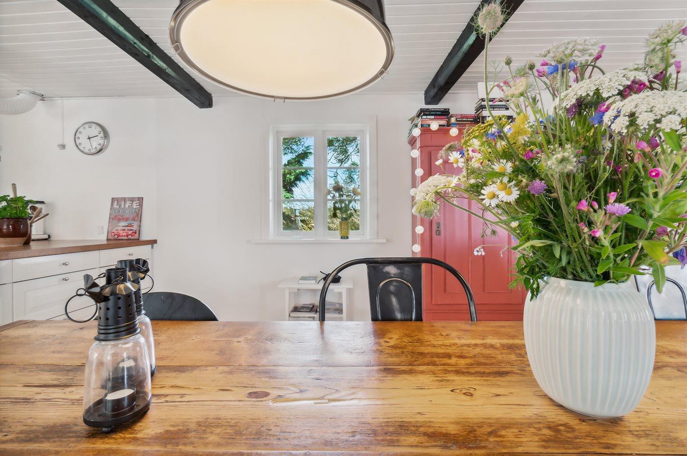 Huset, der ligger idyllisk, rummer tre soveværelser og et pænt badeværelse. Stor stue med køkkenafdeling med masser af plads - hvor man mærker, at huset er gennemrenoveret i 2021 med fritliggende bjælker, så det hele emmer af charme og sjæl.