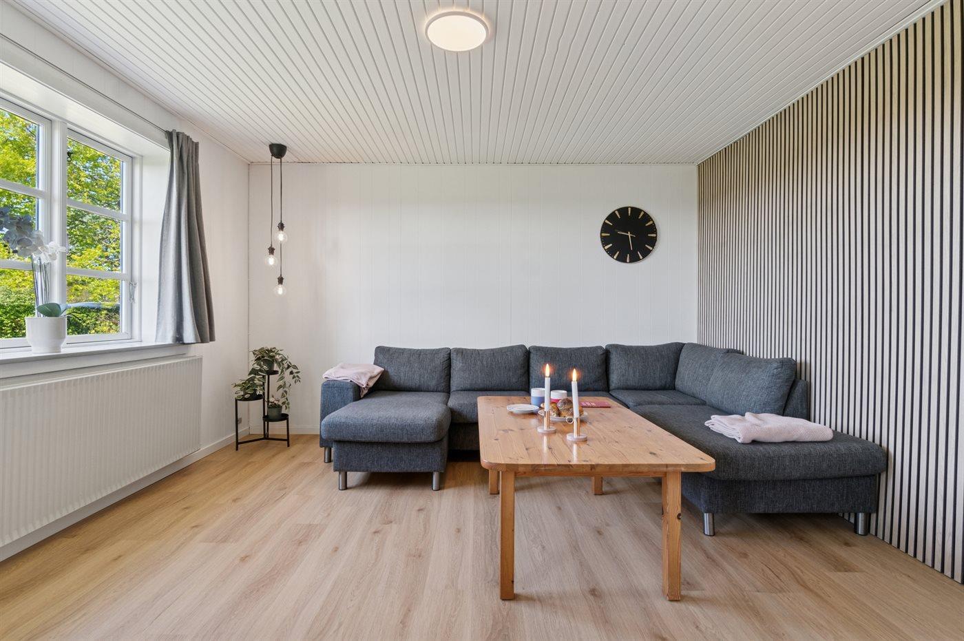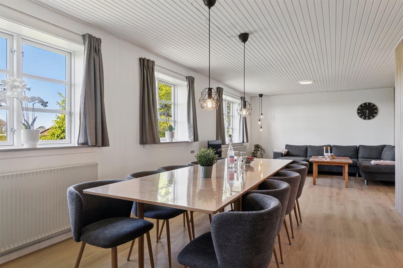 Huset er helårsisoleret og omgivet af en stor afskærmet havegrund. Der er god plads til alle, så to familier eller flere vennepar kan nyde huset og omgivelserne sammen. I den meget store stue med hvide vægge og flotte paneler er der plads til alle ved det lange bord, når måltiderne skal nydes. Der er også mulighed for at nyde timer i udestuen - her er der også hyggeligt og rart.