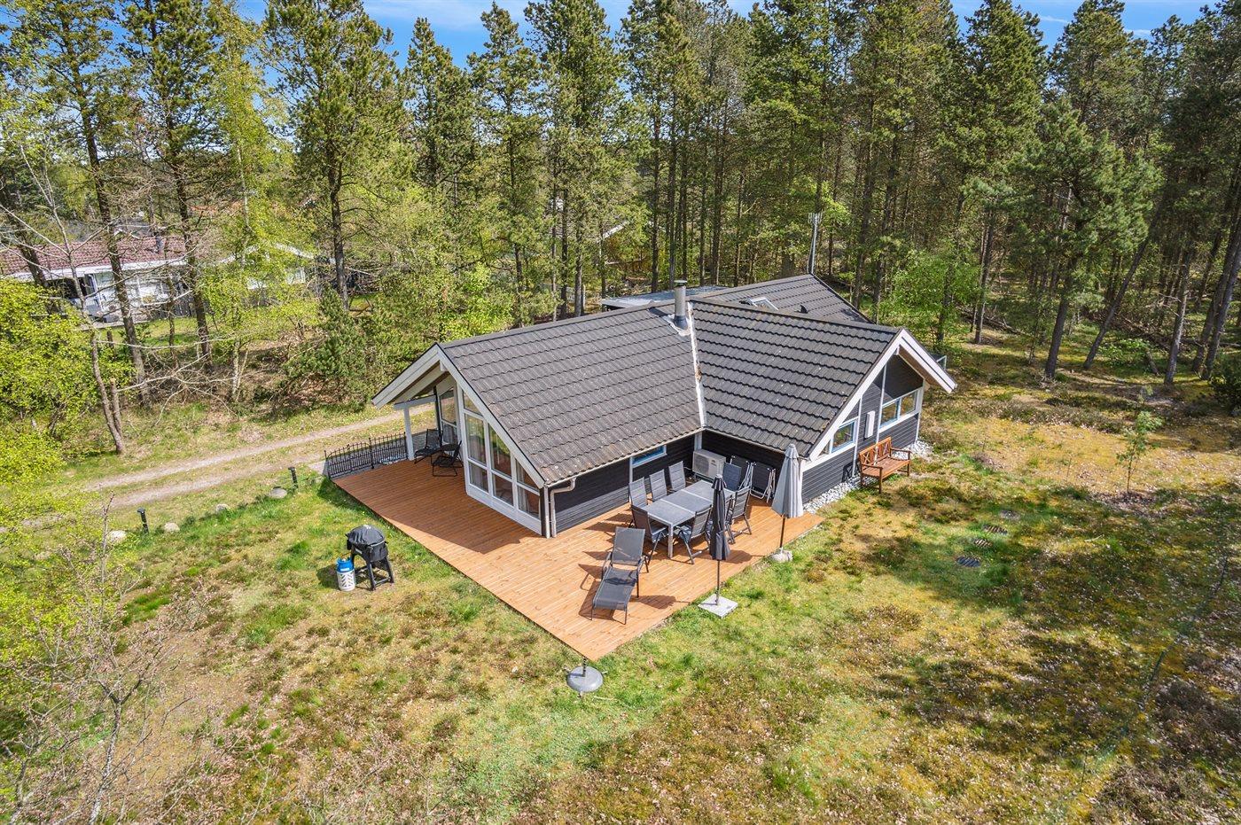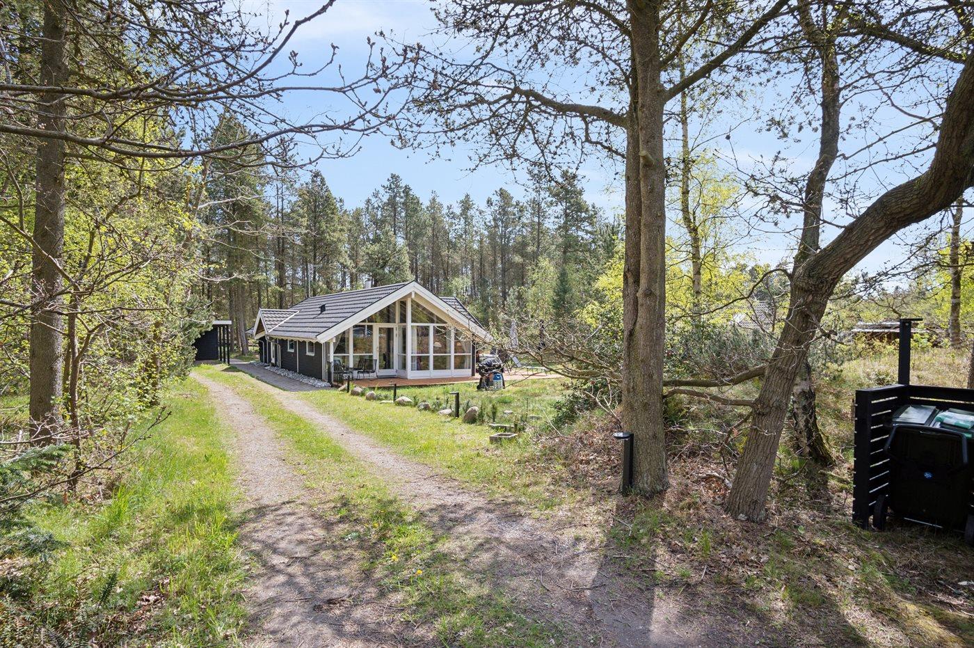 Ferieboligen er beliggende på en 1200 m² stor naturgrund. Grunden er indhegnet. Der er 150 m til havet. Nærmeste forretning er beliggende i en afstand af 3500 m. Der er en golfbane i en afstand af 4700 m. Til ferieboligen hører åbent terrasseareal. Desuden er der overdækket terrasse. Grill til rådighed. Der er carport til rådighed. Der er installeret stik til opladning af elbil. Type 2 stik. Med 11 kW ladeeffekt. Parkering ved ferieboligen.