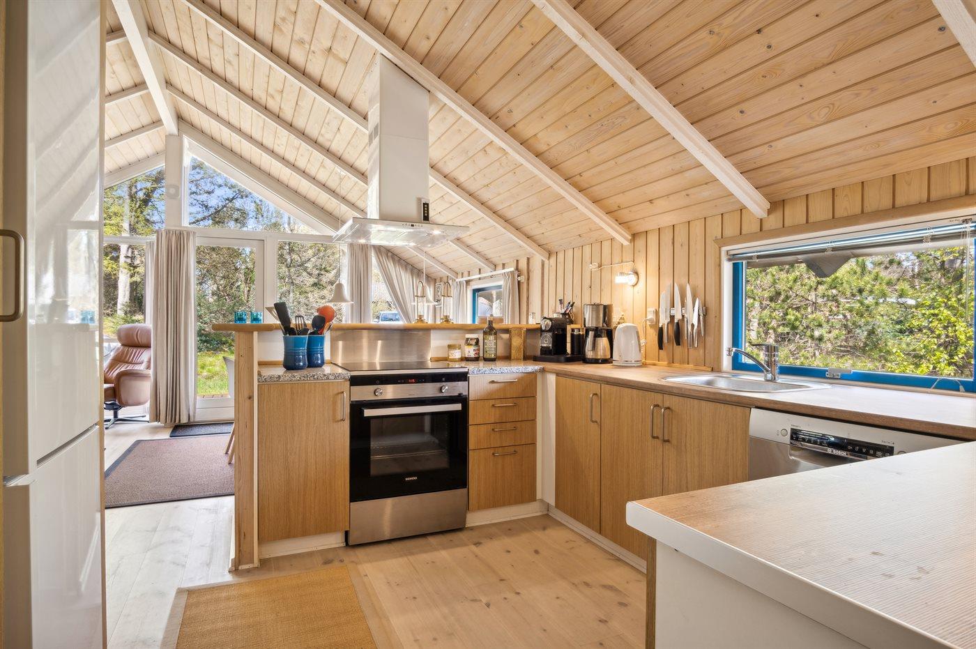 Køkkenet er udstyret med 1 køleskab. Der er 4 induktionskogeplader, varmluftovn, mikrobølgeovn samt opvaskemaskine.