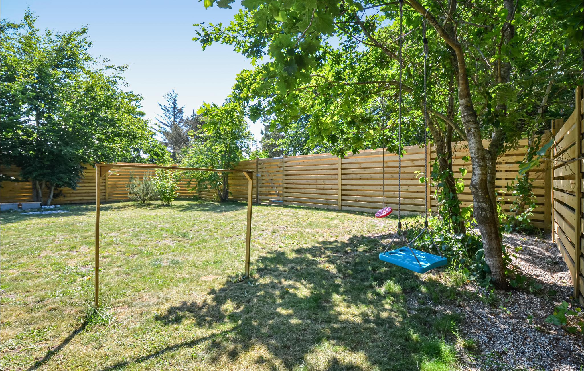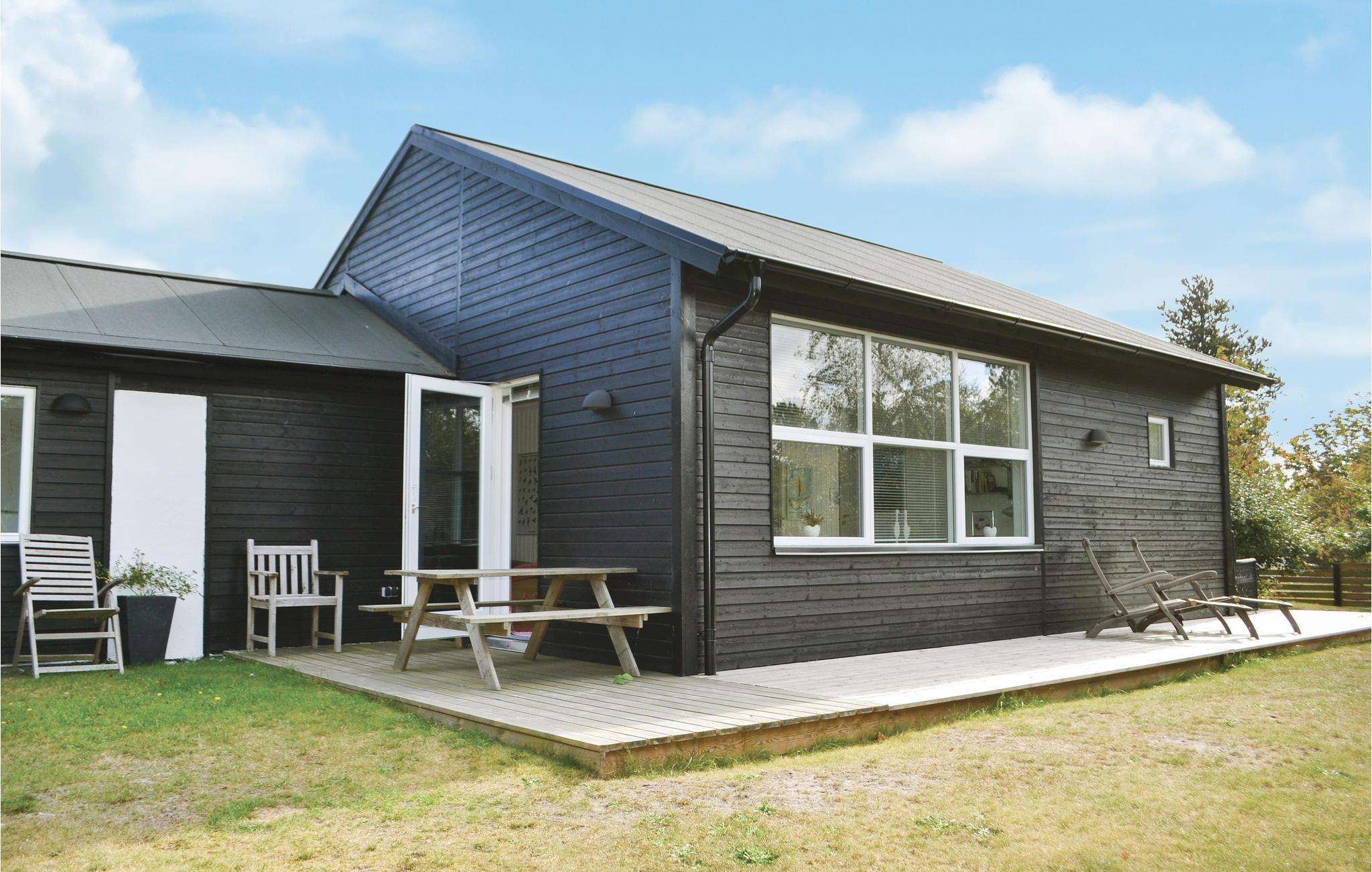 Moderne sommerhus ved Boeslum Strand med udendørs bruser og indhegnet have, perfekt til afslapning og udendørs måltider.