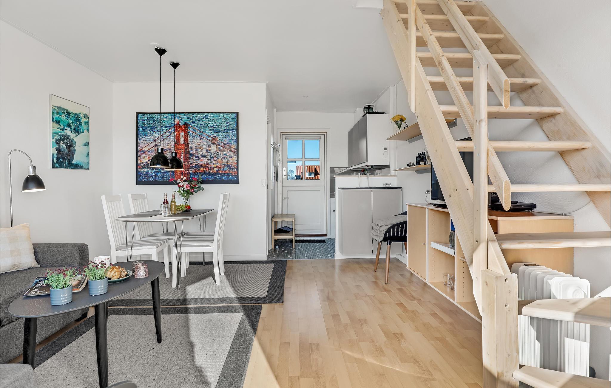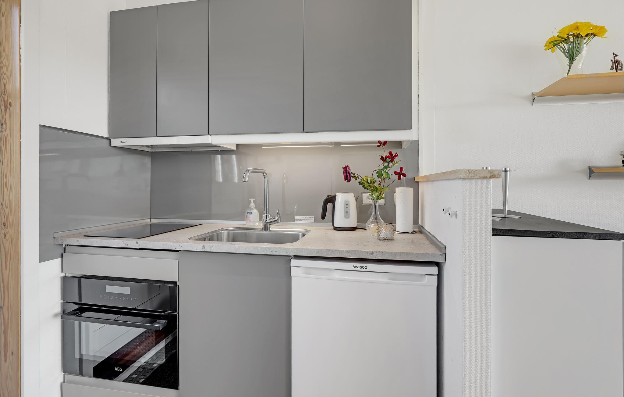 Lejligheden er lyst og venligt indrettet med sovesofa for to personer (150 cm) og en hems med to boksmadrasser (ikke ståhøjde). Fra stuen er der udgang til en privat terrasse med havemøbler og grill, så der er basis for mange skønne sommeraftener under åben himmel.