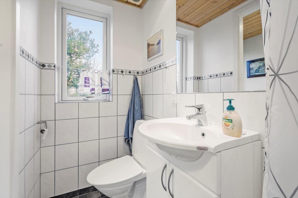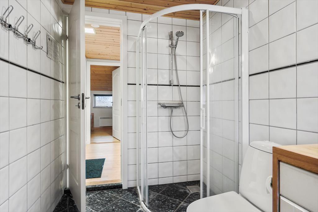Ekstra badeværelse med toilet, håndvask og bruseniche.