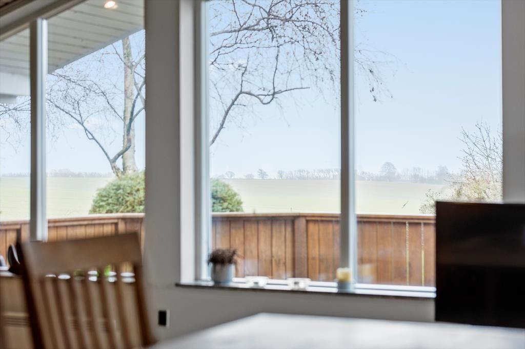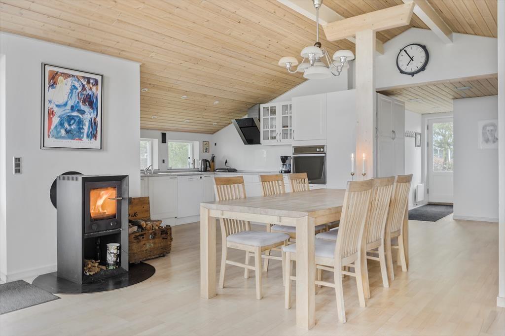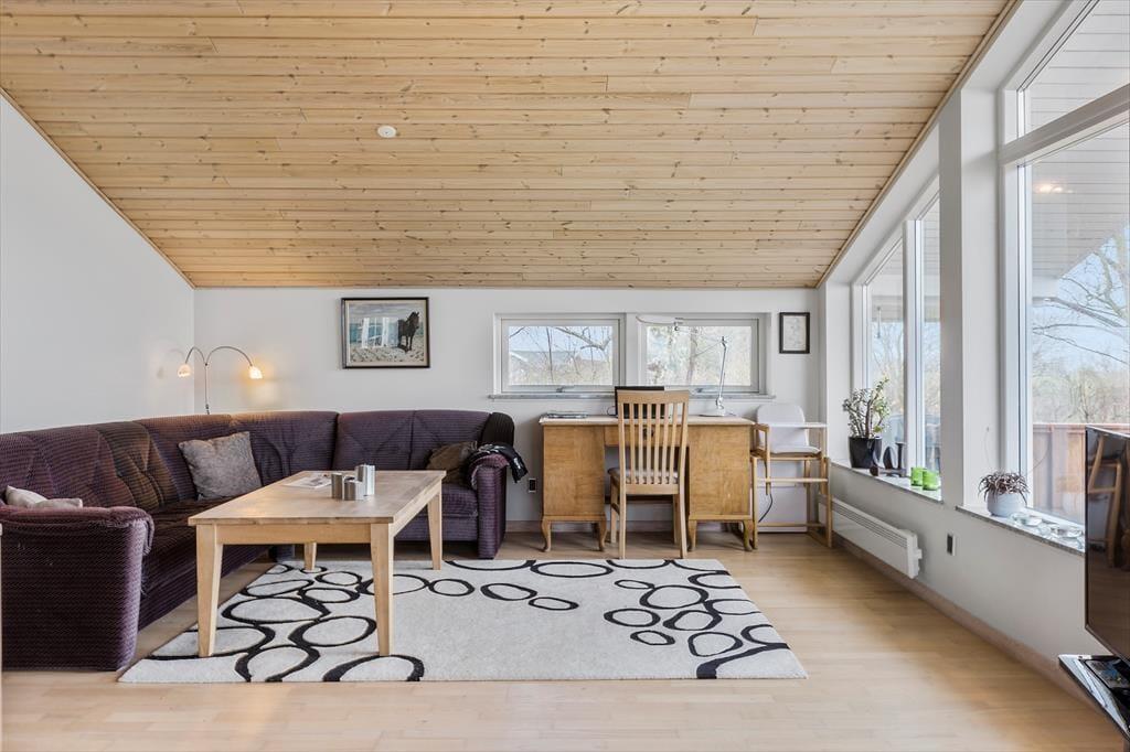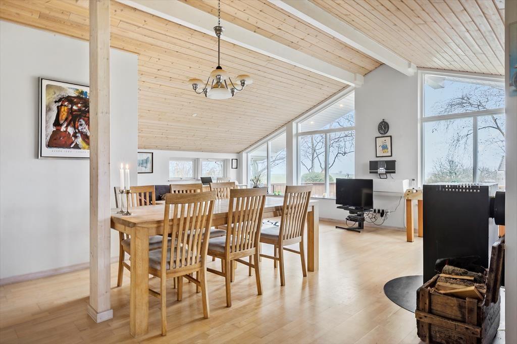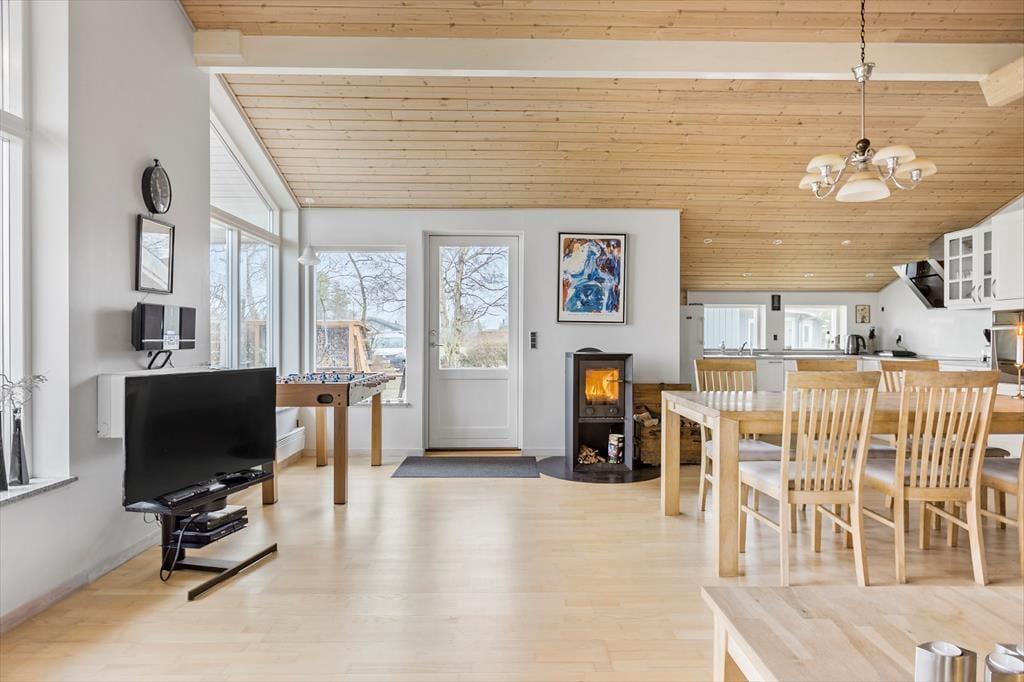 Stor, hyggelig og lys opholdsstue med spiseplads, varmepumpe, brændeovn, udgang til terrassen. Fra stuen er der udsigt til vandet. Der er Bordfodbold.