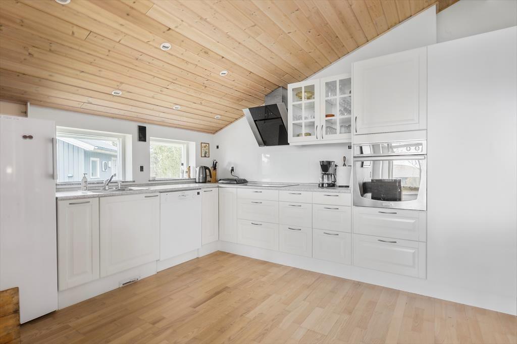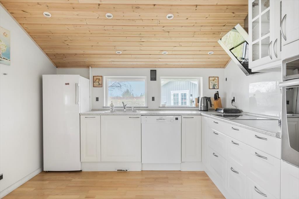 Pænt køkken/alrum med 4 keramiske kogeplader, emhætte, bageovn, mikroovn, køleskab og opvaskemaskine samt Kaffemaskine og elkedel.