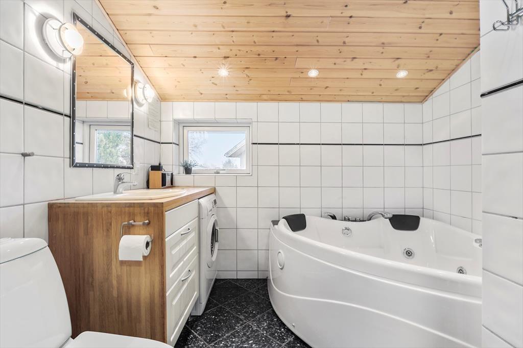 Stort og dejligt badeværelse med toilet, håndvask, bruseniche og spa og vaskemaskine.