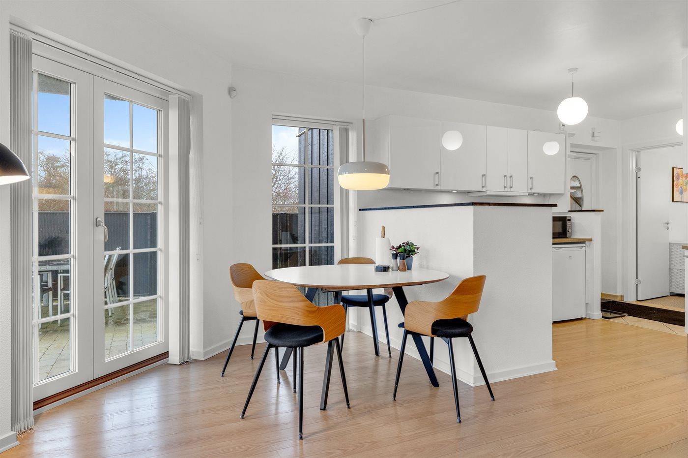 Køkkenet er udstyret med 1 køleskab. Der er 4 keramiske kogeplader, varmluftovn, mikrobølgeovn samt opvaskemaskine.