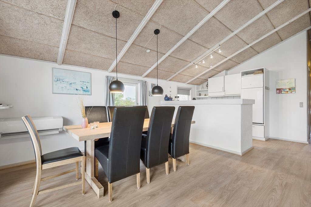 94 m2 får I at brede jer på inden døre i sommerhuset, der fremstår særdeles pænt og velholdt. Takket være de lyse farvetoner og store vinduespartier er atmosfæren let og luftig, og planløsningen er fornuftigt udformet. To soveværelser er begge udstyret med dobbeltseng, mens det tredje rummer to køjesenge, så i alt kan I være otte feriegæster i huset. Det store badeværelse er ikke bare praktisk indrettet med vaskesøjle, men byder også på spabad og sauna, så I kan koble af og stornyde ferielivet. Endelig er der stuen, som er et dejligt højloftet opholdsrum med komfortable møbler, brændeovn og åben forbindelse til et veludstyret køkken.