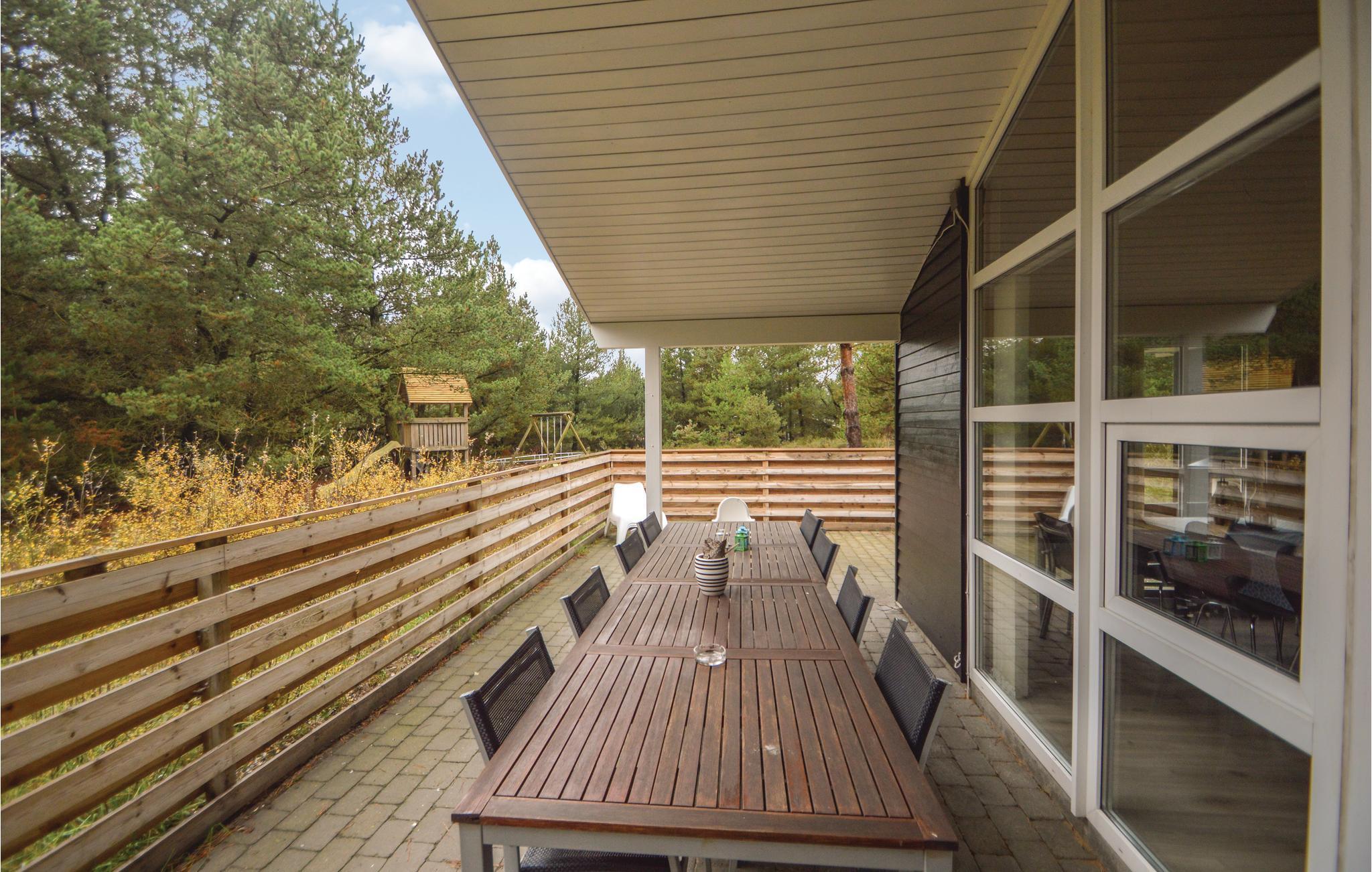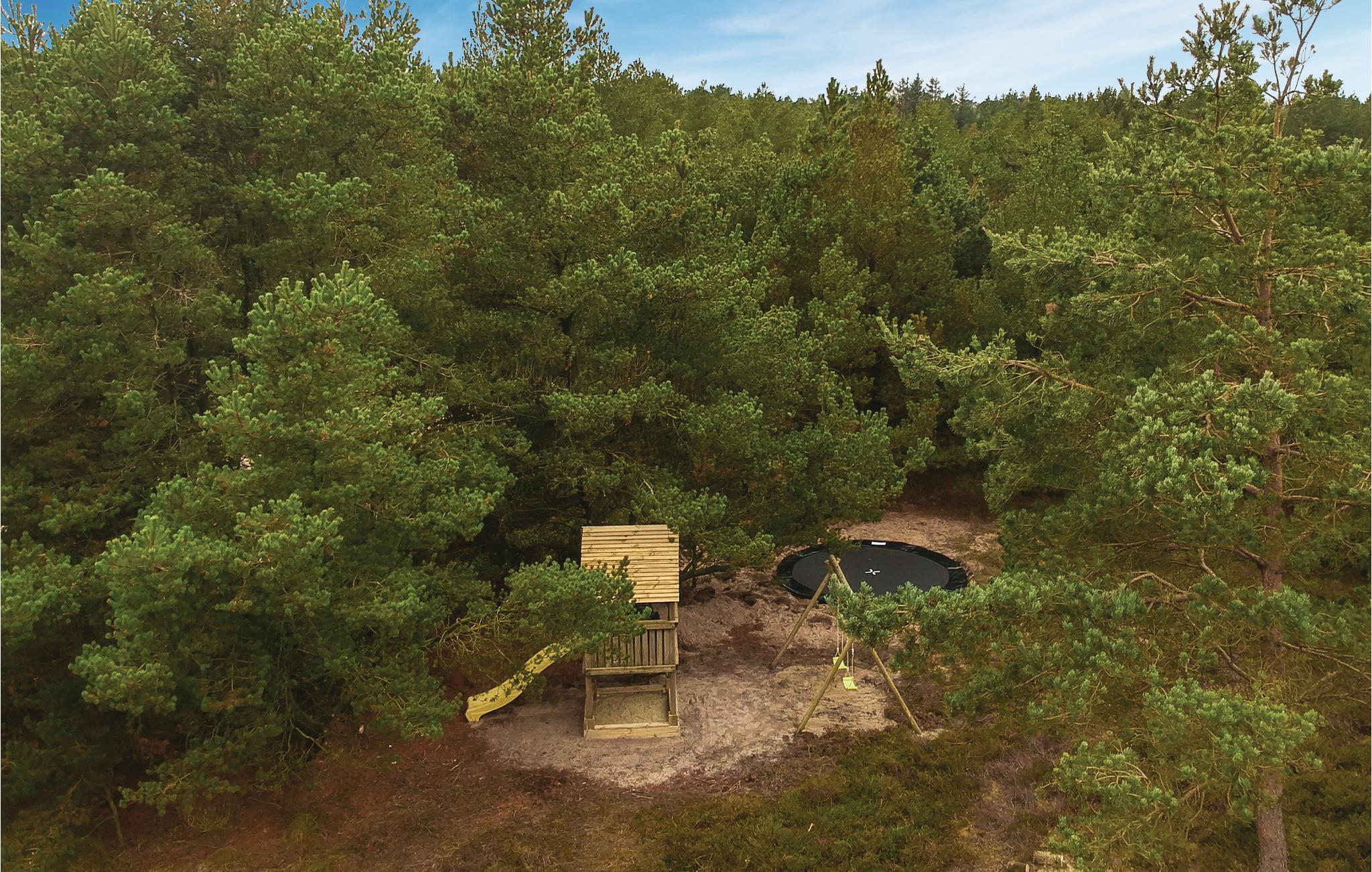 Fra stuen er der udgang til terrassen med havemøbler og grill, hvor I kan opholde jer fra tidligt til sent på de lange varme sommerdage. Den store kuperede naturgrund er et oplagt sted for gemmelege, og legetårnet bliver garanteret også flittigt brugt. 200 m fra feriehuset findes et stort stisystem.