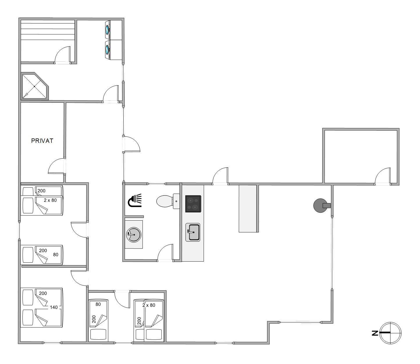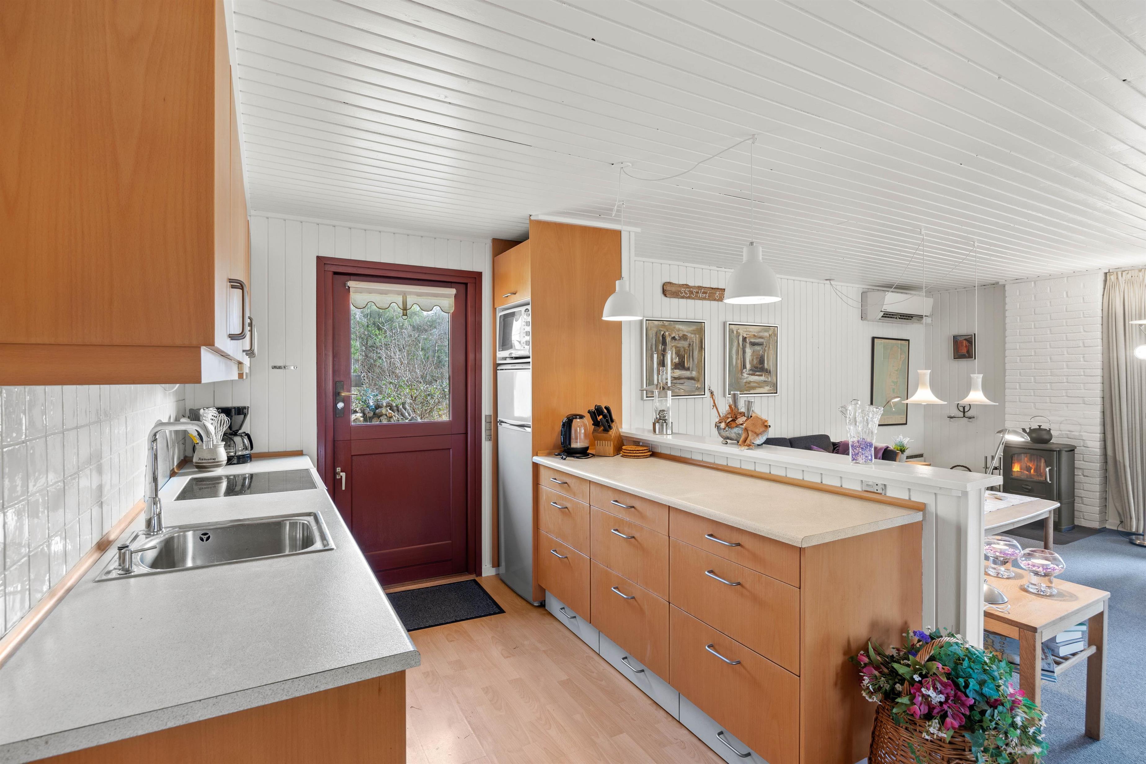 I sommerhuset finder I en hyggelig stue med en brændeovn, der skaber en varm og behagelig stemning, perfekt til kølige aftener. Varmepumpen sørger for ekstra komfort hele året rundt. Stuen ligger i åben forbindelse til køkken og spiseplads, så dette kommer til at være det naturlige samlingsrum for jer under ferien. I stuen er der en parabol fjernsyn, så i har mulighed for en hyggelig filmaften sammen med hele familien.