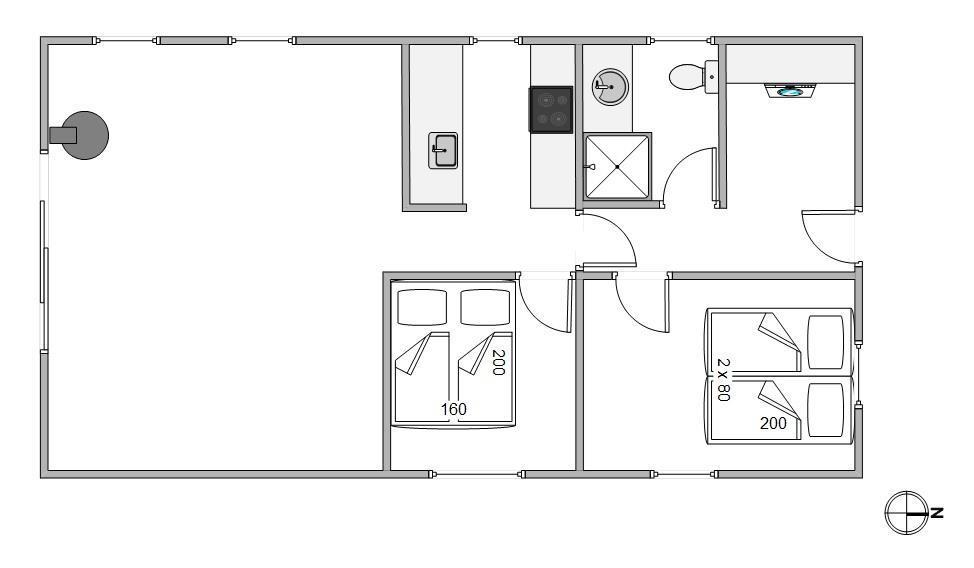 I huset finder du et køkken, der er fuldt udstyret med blandt andet opvaskemaskine. Det ligger i åben forbindelse med både spisestuen og opholdsstuen, hvor du kan finde en hyggelig brændeovn og et tv. Det er det ideelle sted at slappe af og hygge sig efter en dag fuld af oplevelser.