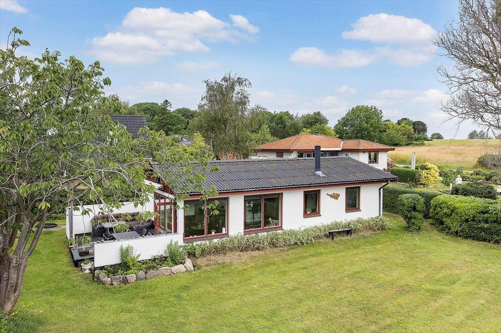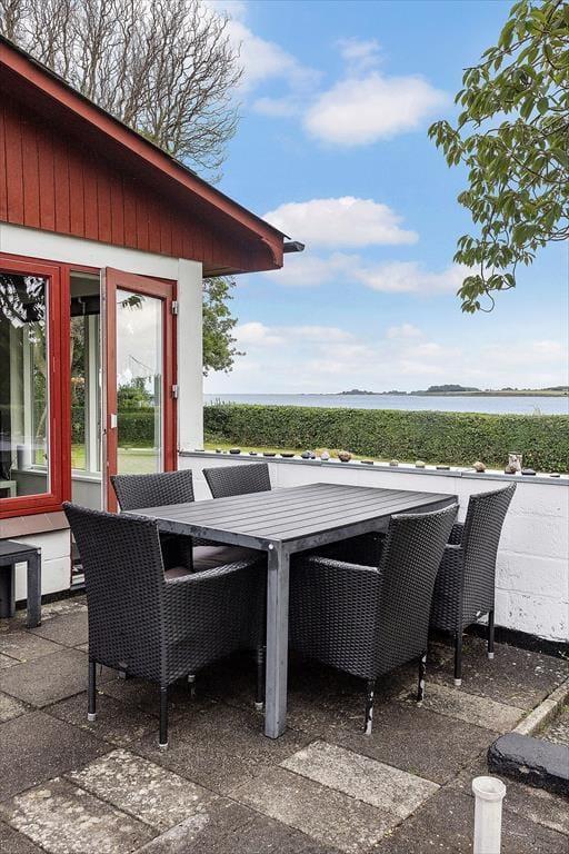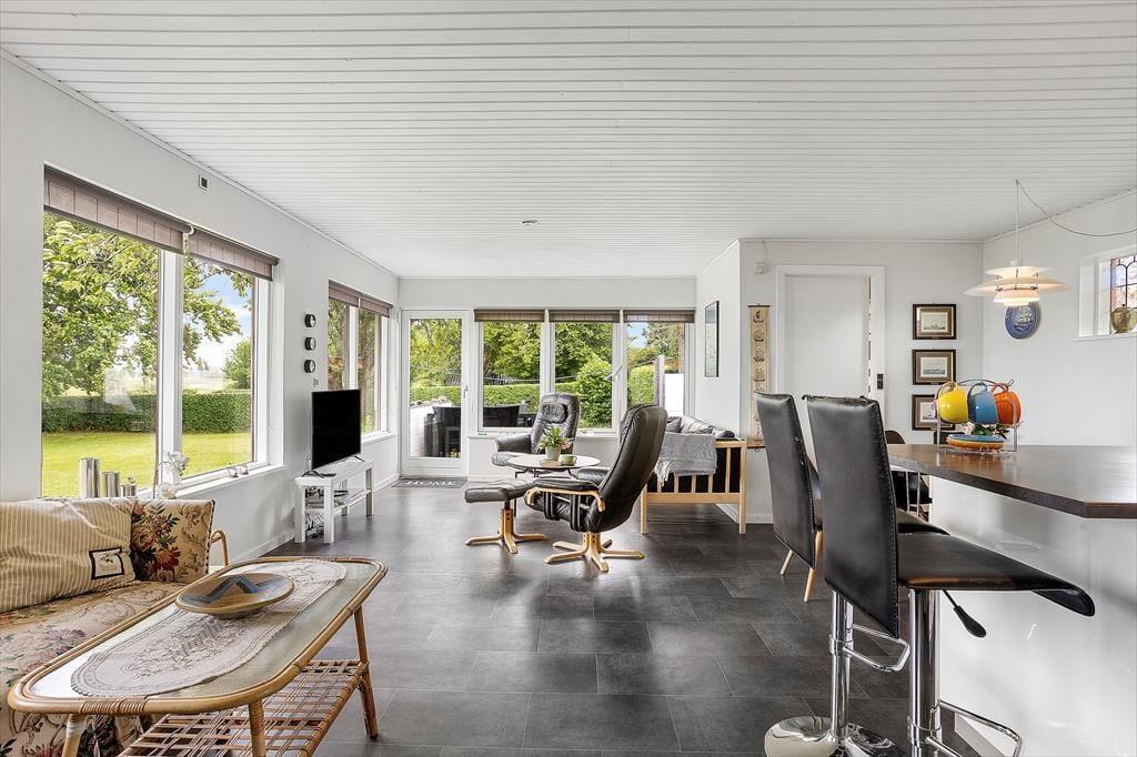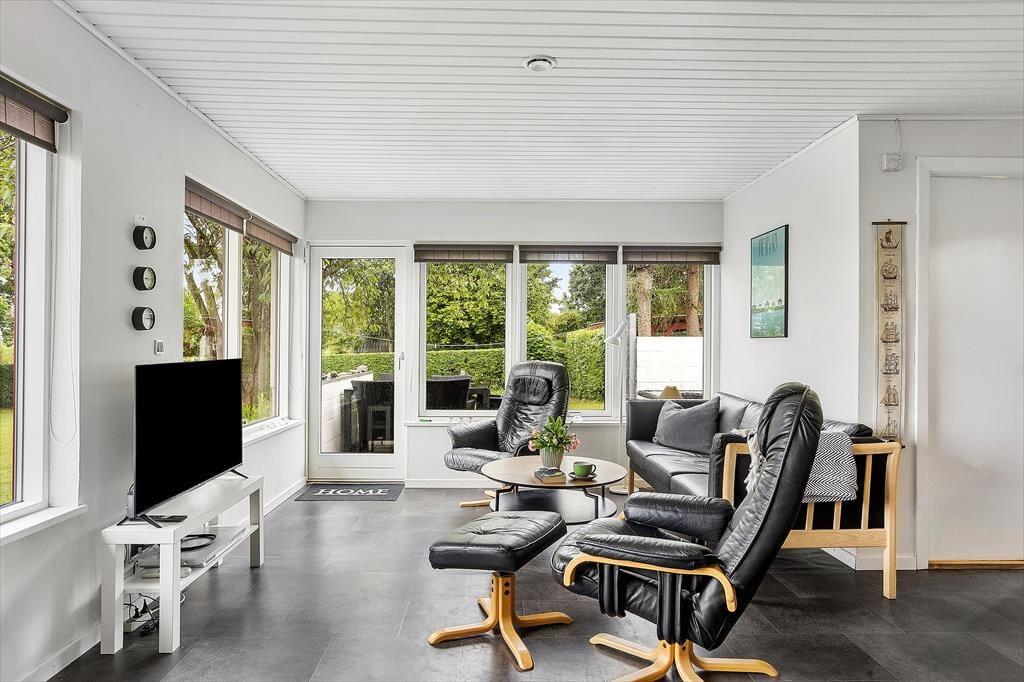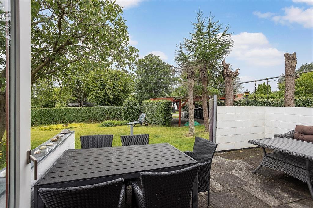 Udenfor venter en dejlig have og terrasse, hvor du kan nyde solen og den friske luft. Den grønne plæne er perfekt til en afslappende stund i solen eller til at lege og hygge sig med børnene. På den store terrasse kan du nyde måltider udendørs, og om aftenen er det en skøn oplevelse at tænde grillen og tilberede din middag under åben himmel. Uanset om du ønsker at sidde med en kop kaffe og læse en god bog eller blot slappe af og nyde den rolige atmosfære, så er der rig mulighed for det her. Fra haven kan du nyde den smukke natur, og den korte afstand til vandet betyder, at du kan høre bølgerne og mærke den forfriskende havluft.
