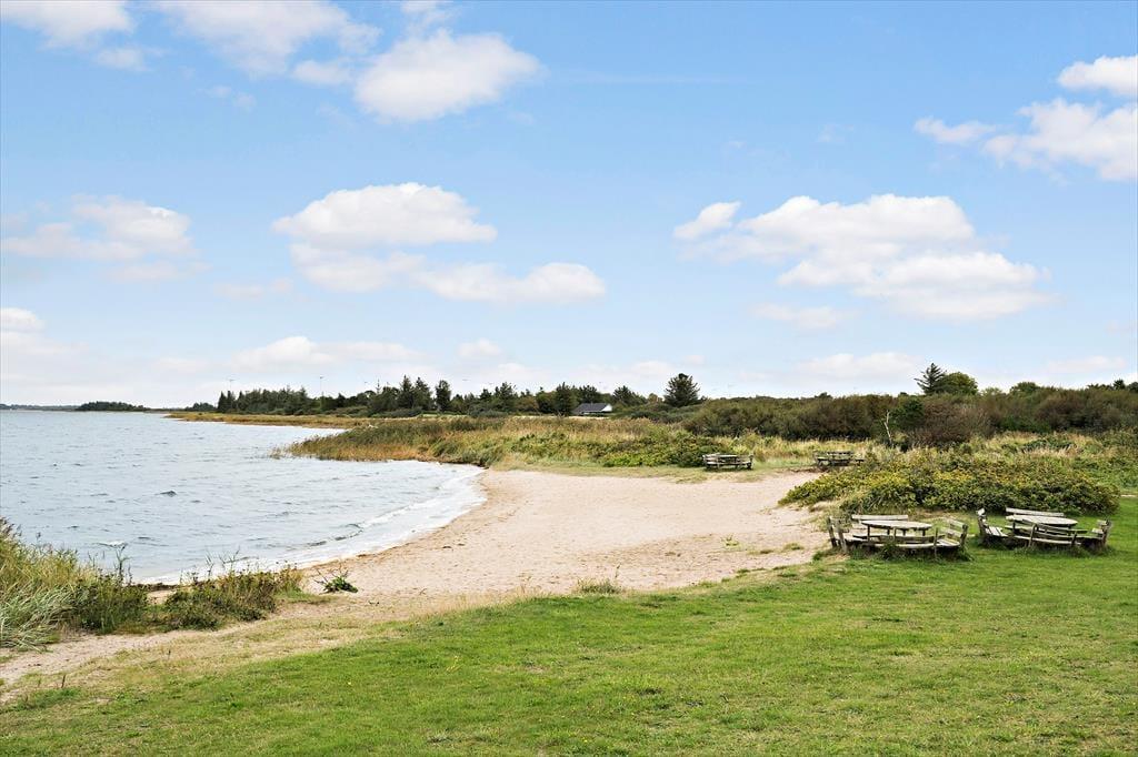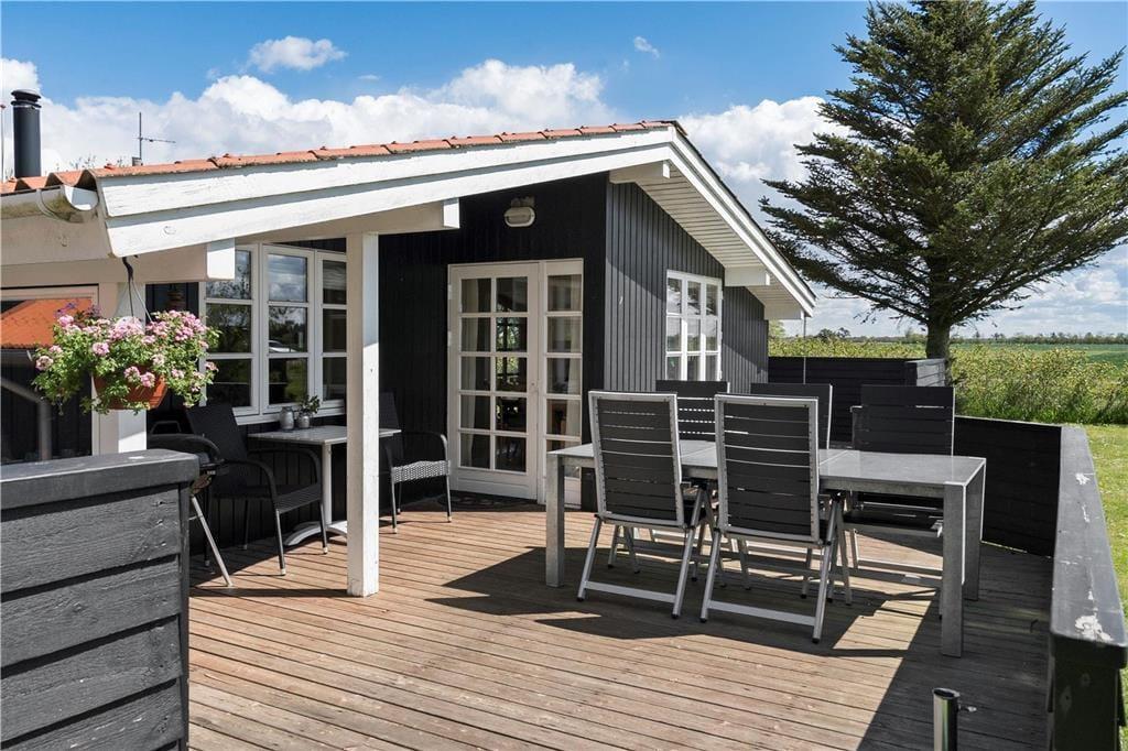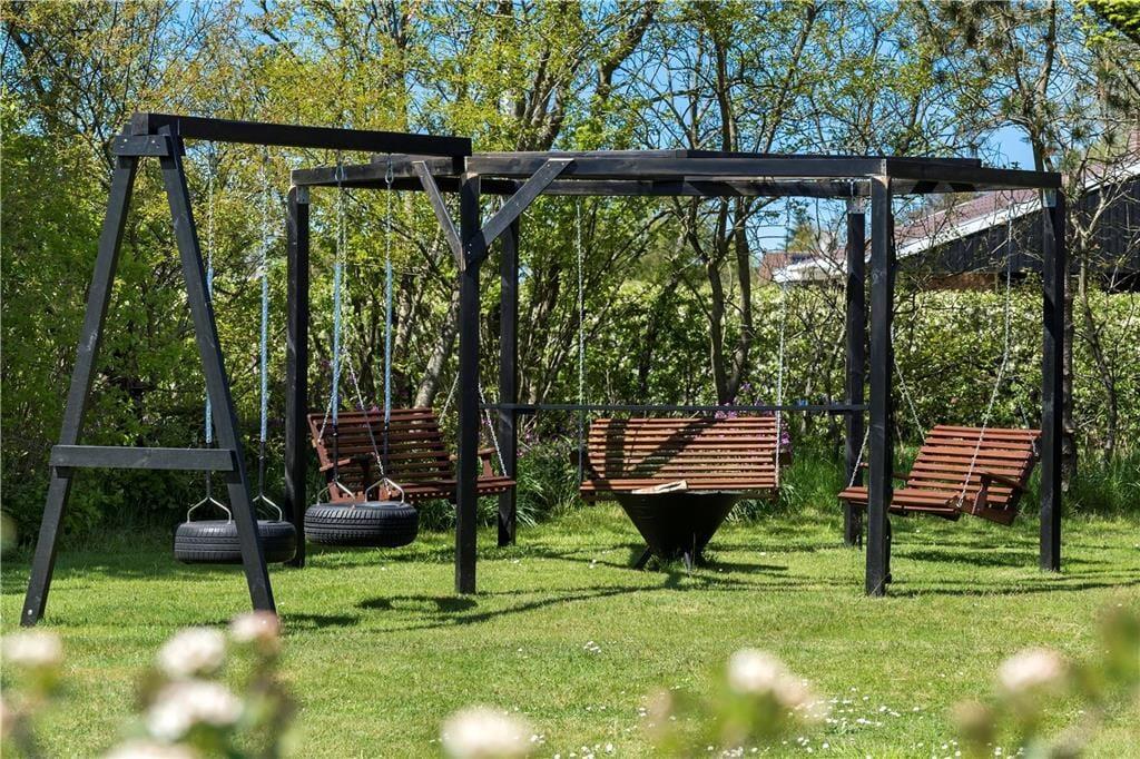 Terrassemiljøet er stort og delvist overdækket, og det breder sig om flere sider af feriehuset, så der er flere gode solkroge at vælge imellem. Mod øst kan I skue ud over det åbne marklandskab, der breder sig på den anden side af hækken – og det er en dejlig udsigt, uanset om I slapper af i havestolene eller leger på græsplænen. Desuden er der et flot gyngemiljø med bålplads.
