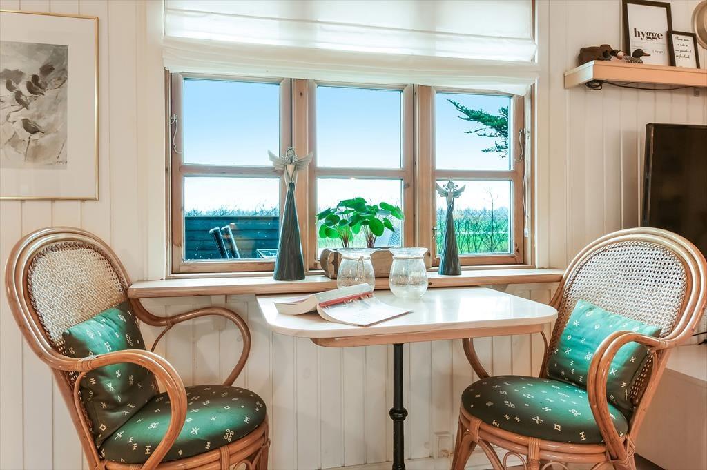 Udover at ligge smukt og fredeligt placeret på en lukket vej er der mange andre kvaliteter ved huset. Det er nemlig både rummeligt og stemningsfuldt, og det hyggeskabende møblement bidrager til den gode atmosfære. I den store stue er der gennemstrømmende lysindfald, brændeovn samt TV med både danske og tyske kanaler, og på velfungerende vis er der åben forbindelse til en veludstyret køkkenafdeling. Et pænt badeværelse og et bryggers med vaskemaskine er også del af planløsningen, og når det er ved at være sengetid, kan I se frem til en god nats søvn på de to soveværelser. Er der ikke sengepladser nok på værelserne, kan I rede op i annekset, som I kan gå tørskoet hen til via terrassen.