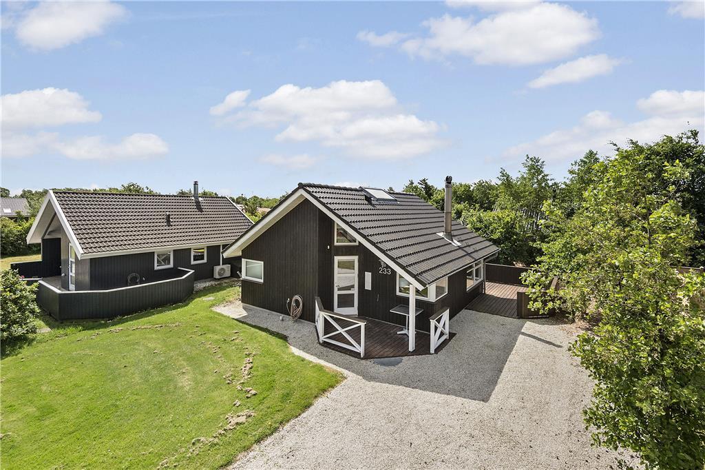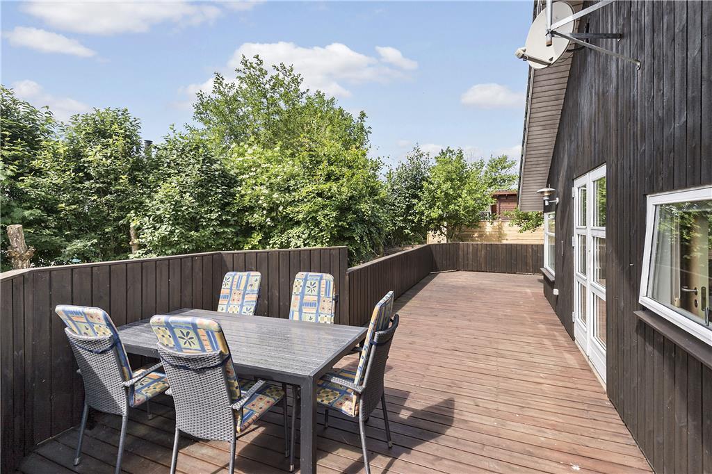Ude i det fri på den velanlagte grund er der et mindre græsareal og en indkørsel foran huset – foruden en delvist overdækket terrasse ved hoveddøren. Trænger I til at sidde og slappe af i en god havestol, er det dog oplagt at flytte om på den anden træterrasse, der både er større og mere solrig, og så ligger den dejligt ugeneret i den sydvendte baghave.