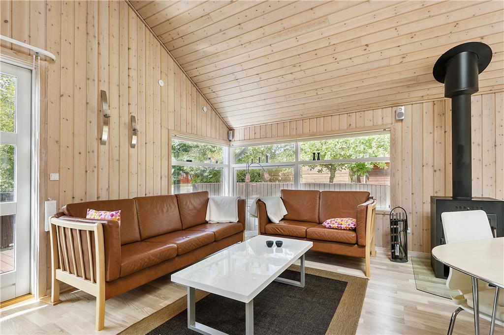Sommerhuset er med sine 54 m2 ikke et af de største på markedet – men det betyder bestemt ikke, at man er gået på kompromis med kvaliteten og komforten. Inden døre er hver eneste kvadratmeter nemlig supergodt udnyttet, så I har et veludstyret åbent køkken at kokkerere i, og et bryggers med vaskemaskine er der også fundet plads til. På badeværelset kan I ligefrem slappe af og nyde livet i spabadet, inden hele familien samles i stuen for at tilbringe en hyggelig aften i sofaafdelingen nær brændeovnen. Soveværelser er der to af i huset, og de er begge udstyret med gode dobbeltsenge og garderobeskab. Sidst, men ikke mindst, finder I allerøverst oppe en rummelig hems, der både kan bruges som soveplads og som hyggekrog i løbet af dagen.