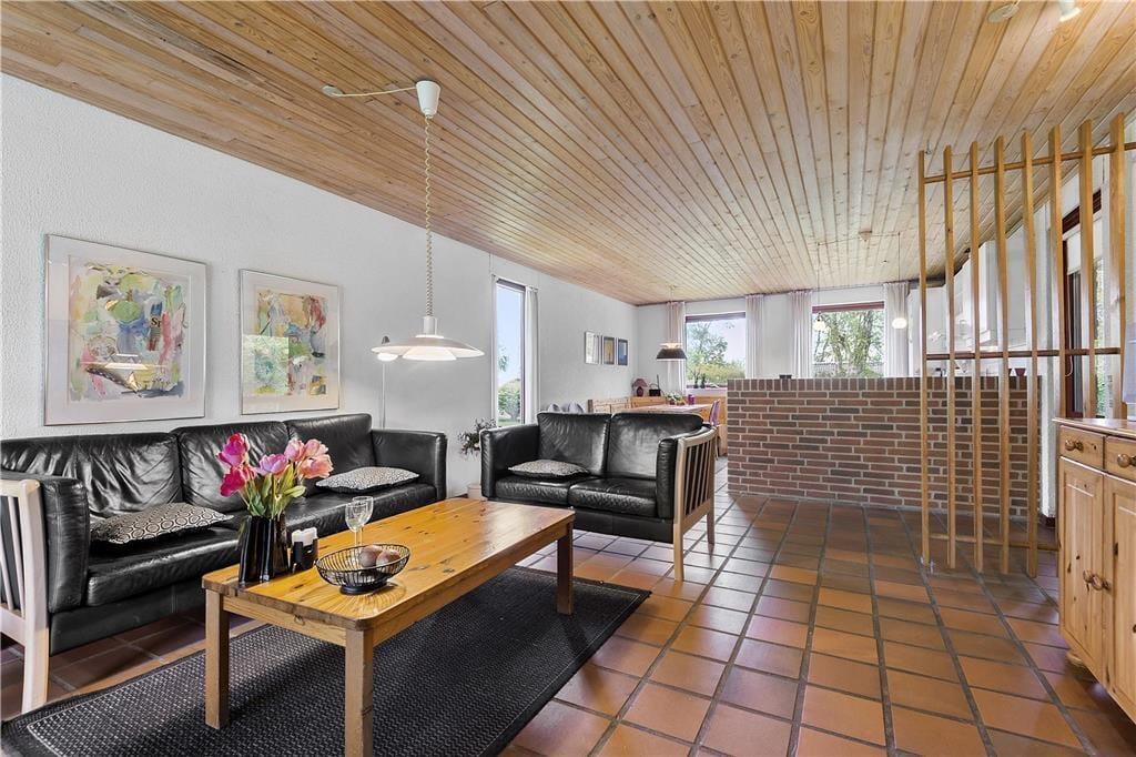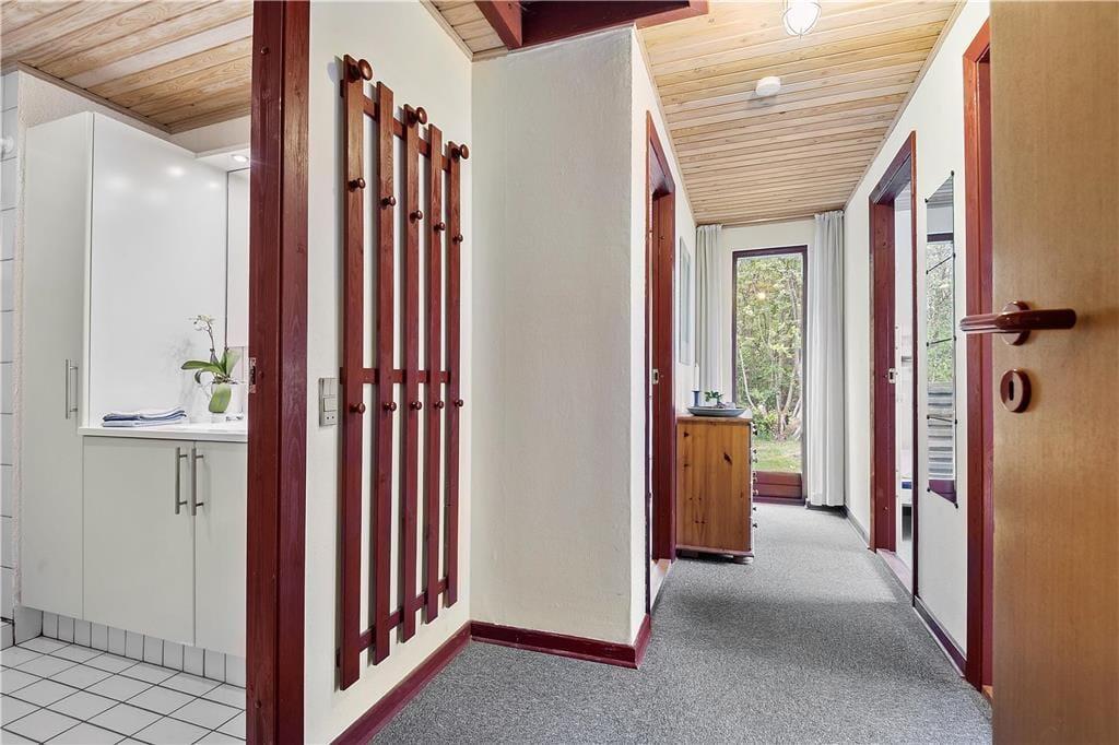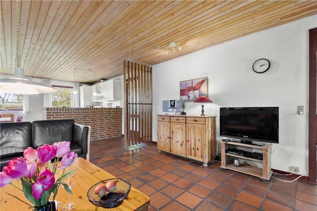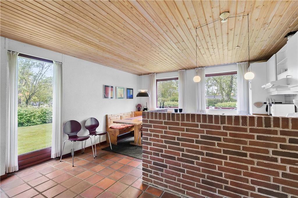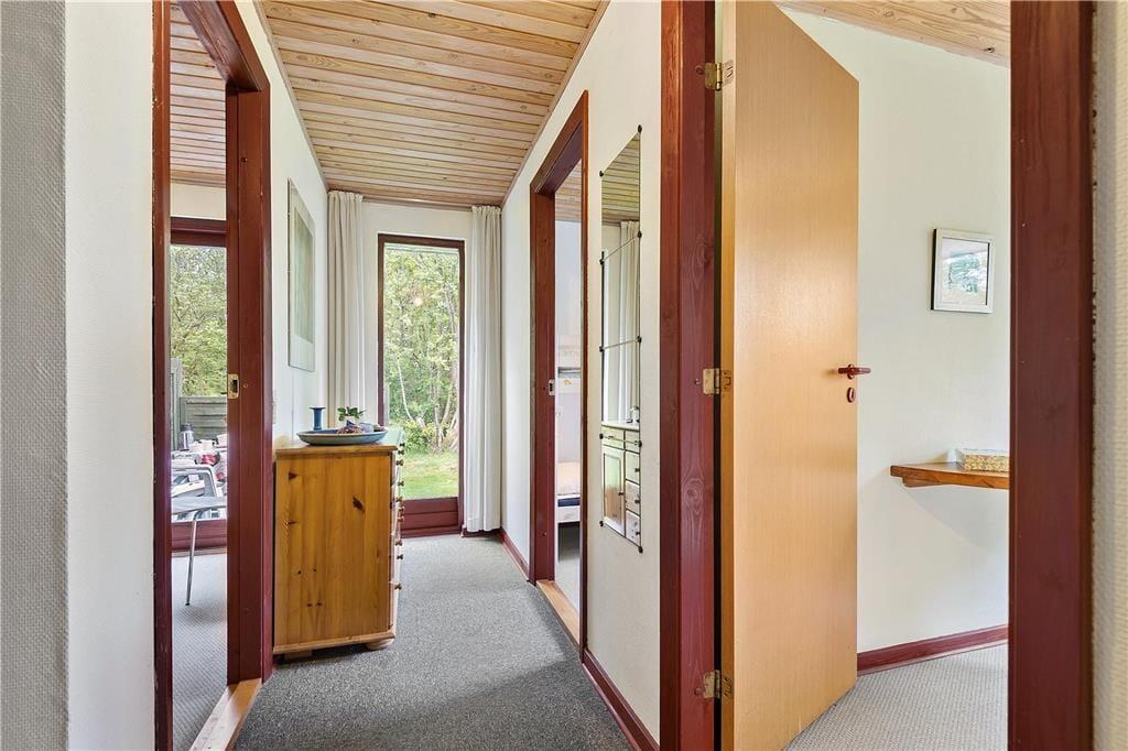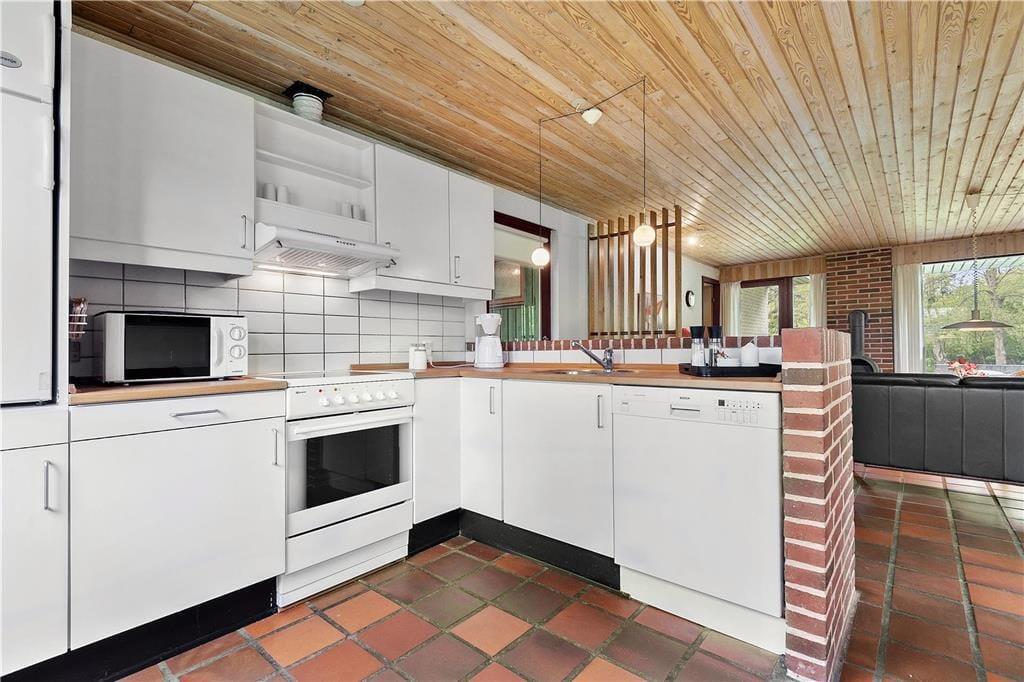Holder I ferie på et tidspunkt af året, hvor I gerne vil tilbringe mange timer inden døre, vil sommerhusets stue fungere som det oplagte samlingspunkt både morgen, middag og aften. I kan starte med at servere dagens første kop kaffe ved spisekrogen i det åbne køkken – og her kan I egentlig sagtens blive siddende for at spille brætspil, tegne og lave andre hyggelige fællesaktiviteter. Vil I sidde lidt mere komfortabelt, kan I rykke hen i sofaafdelingen for at se film på TV’et, og vil I skrue ekstra op for den gode stemning, kan I tænde op i brændeovnen. Et badeværelse og tre soveværelser hører også med til planløsningen, og der er en barnestol til rådighed til småbørnsfamilier.
