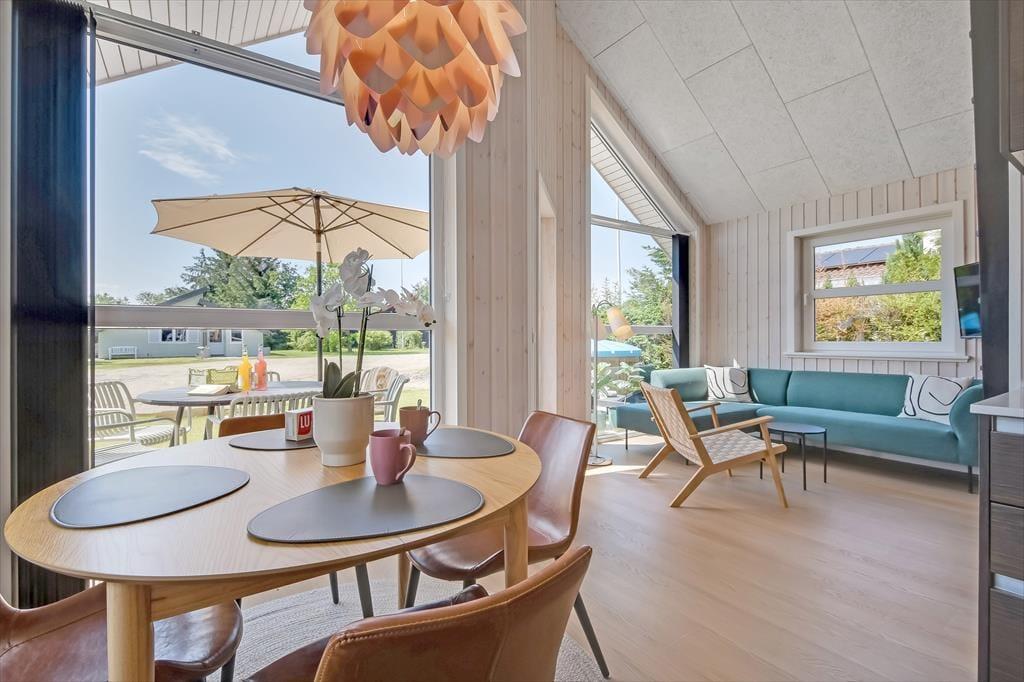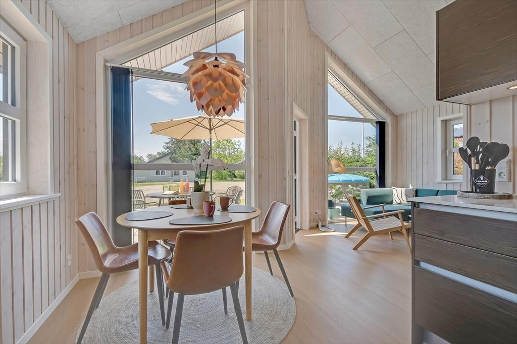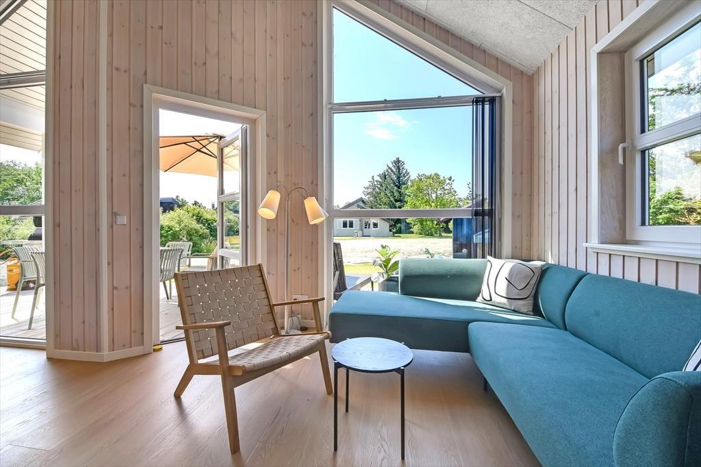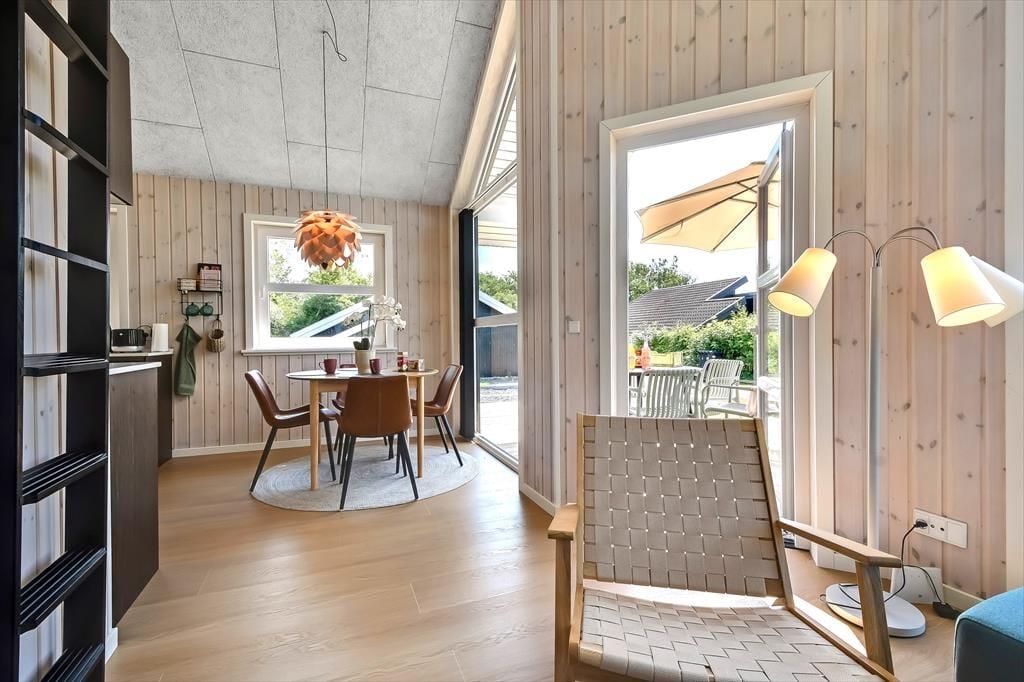Der er gjort god brug af hver eneste kvadratmeter i sommerhuset, og planløsningen passer fint til fire personer. De to gode soveværelser og det stilfulde badeværelse er alle rare rum at opholde sig i – men det skønneste er nu alligevel stuen, der har loft til kip, store vinduer og en stige op til en hyggelig hems. Interiøret er både kønt og komfortabelt, og takket være den åbne forbindelse til stuen er det nemt for dig at smutte hen for at brygge mere kaffe eller påbegynde madlavningen. Når den varme drik eller måltidet står klart, kan du og dine kære slå jer ned ved spisebordet, hvis ikke I rykker den fælles hyggestund ud på det tilstødende terrasseareal.
