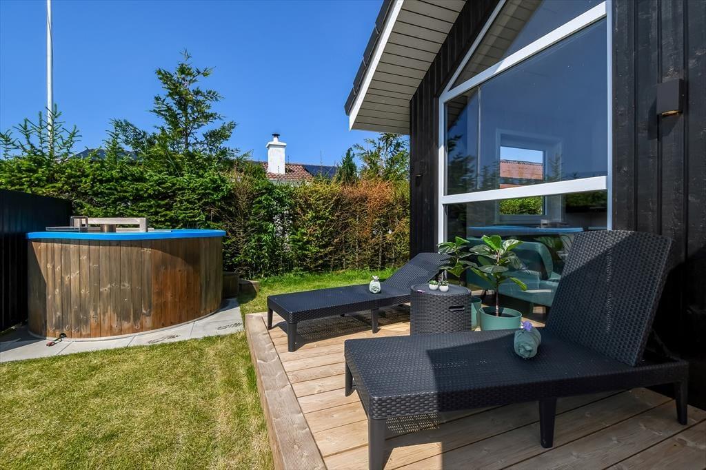Når solskinsvejret lokker dig og dine kære udenfor, er det oplagt at smutte ud i Bork Hytteby for at lege på legepladserne eller gå tur i de grønne omgivelser – men det er nu også fristende at blive på sommerhusets lille, men dejlige grund, der ligger roligt i bunden af en lille vej. Det gode terrassemiljø er orienteret mod både øst og syd, så du kan finde en solrig opholdsplads det meste af dagen. Og når solen er gået ned, og tusmørket begynder at sænke sig, er en afslappende stund i vildmarksbadet måske lige det, der kan lade dine batterier op og give dig ro i sindet.