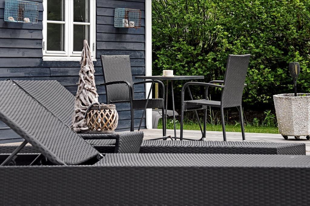 Huset har lige så meget at byde på udendørs – en del af terrassen er overdækket, og her er der spiseplads og grill. Yderligere er der et udekøkken til rådighed, hvor maden eller den friskfangede fisk kan tilberedes. Her er også plads til både afslapning og liggestole, hvis nogen skulle have brug for en lur i den friske luft. For enden af terrassen er der også en stor græsplæne, så alt i alt er her masser af plads for både store og små under den åbne himmel.