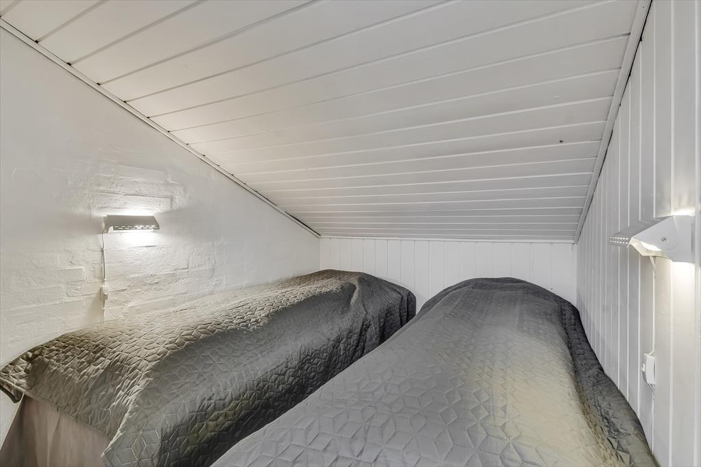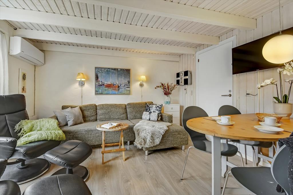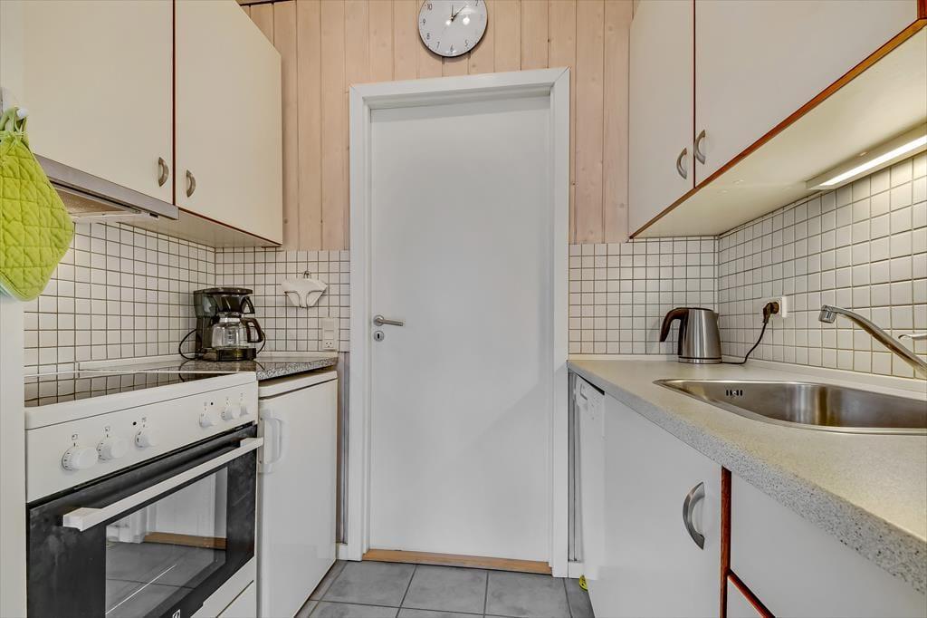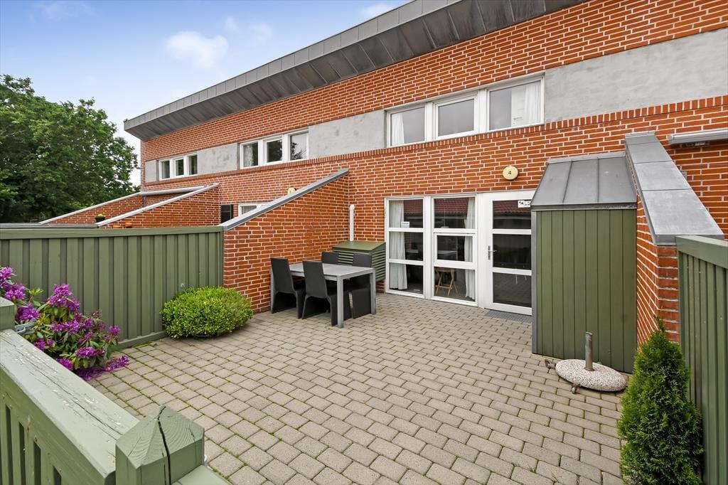 I forlængelse af stuen breder en dejlig terrasse sig, og det er det helt rette sted at være, når solen står højt på himlen, og der er sommerstemning i luften. Terrassen er helt aflukket, så der er skærmet godt af, når du vil nyde en kop formiddagskaffe eller få en kølig forfriskning inden aftensmaden – som for øvrigt også kan indtages i det fri, hvis du og familien ønsker at få det maksimale ud af det gode vejr. Hvis du har små børn med på ferie, vil de med garanti blive glade for bebyggelsens hyggelige legepladser, og uanset alder er det herligt at have både fjord, havn og badestrand inden for meget bekvem rækkevidde.