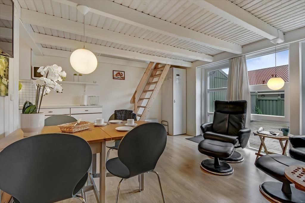 Med sådan en beliggenhed får du rig mulighed for at udforske Bork Havn og det smukke landskab langs med Ringkøbing Fjord – og når du vender hjem efter alle oplevelserne, fungerer lejligheden som din rare og trygge base. Du og dine kære kan se frem til masser af hyggestunder i stuen, der er indrettet med sofa, lænestole og spisebord såvel som et integreret køkken i lyse farvetoner. Et badeværelse er her selvfølgelig også, og når det er sengetid, kan I fordele jer på tre gode soveværelser. Bemærk venligst, at to af dem ligger på førstesalen, og de er udstyret med skydedøre, hvis du gerne vil lukke helt af.