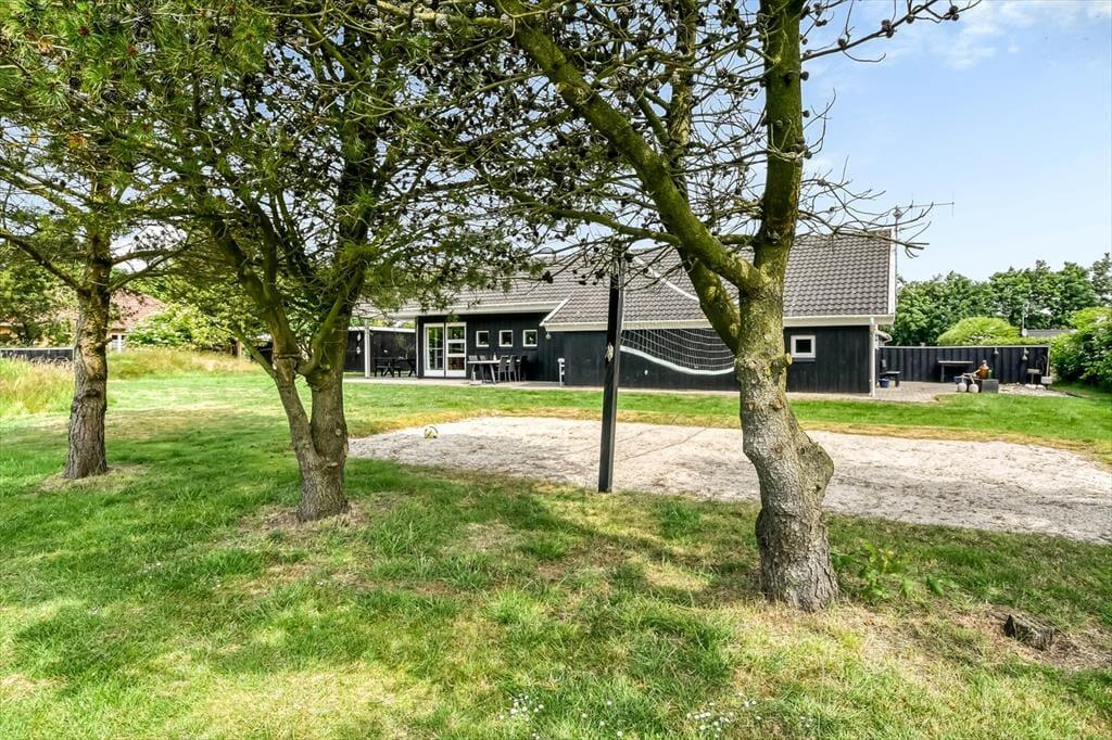 Sommerhusets store grund er en oase for både store og små. Her kan I tage en frisk dyst på den private volleyballbane, hvor grin og gode stunder hurtigt finder vej. Den grønne have omkranses af hæk og buske, som sikrer jer masser af privatliv, og terrassen inviterer til afslappende stunder i solen eller hyggelige grillaftener. Fra haven kan I nyde den fredfyldte udsigt til det omkringliggende, grønne område, der strækker sig bag grunden – et perfekt sted at lade tankerne flyve og bare være til stede i nuet.